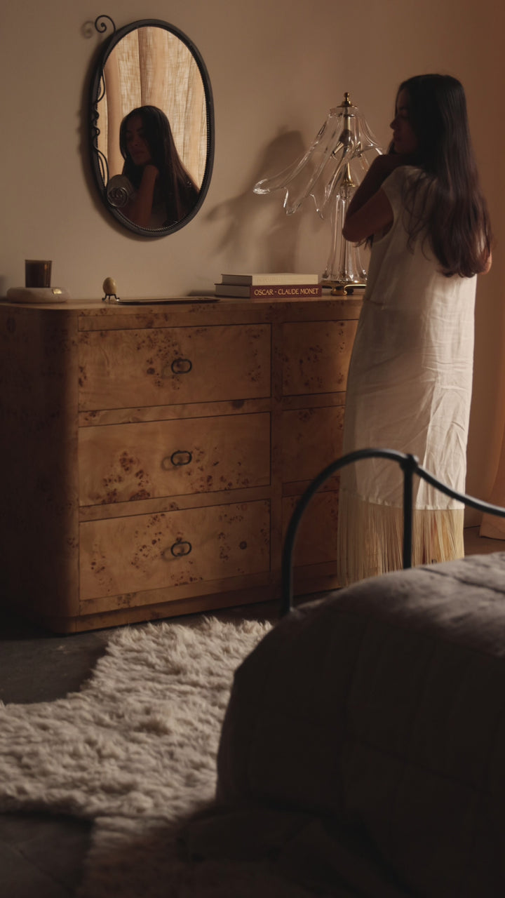 Old-world forms reimagined in richly grained Honey and Cognac burl