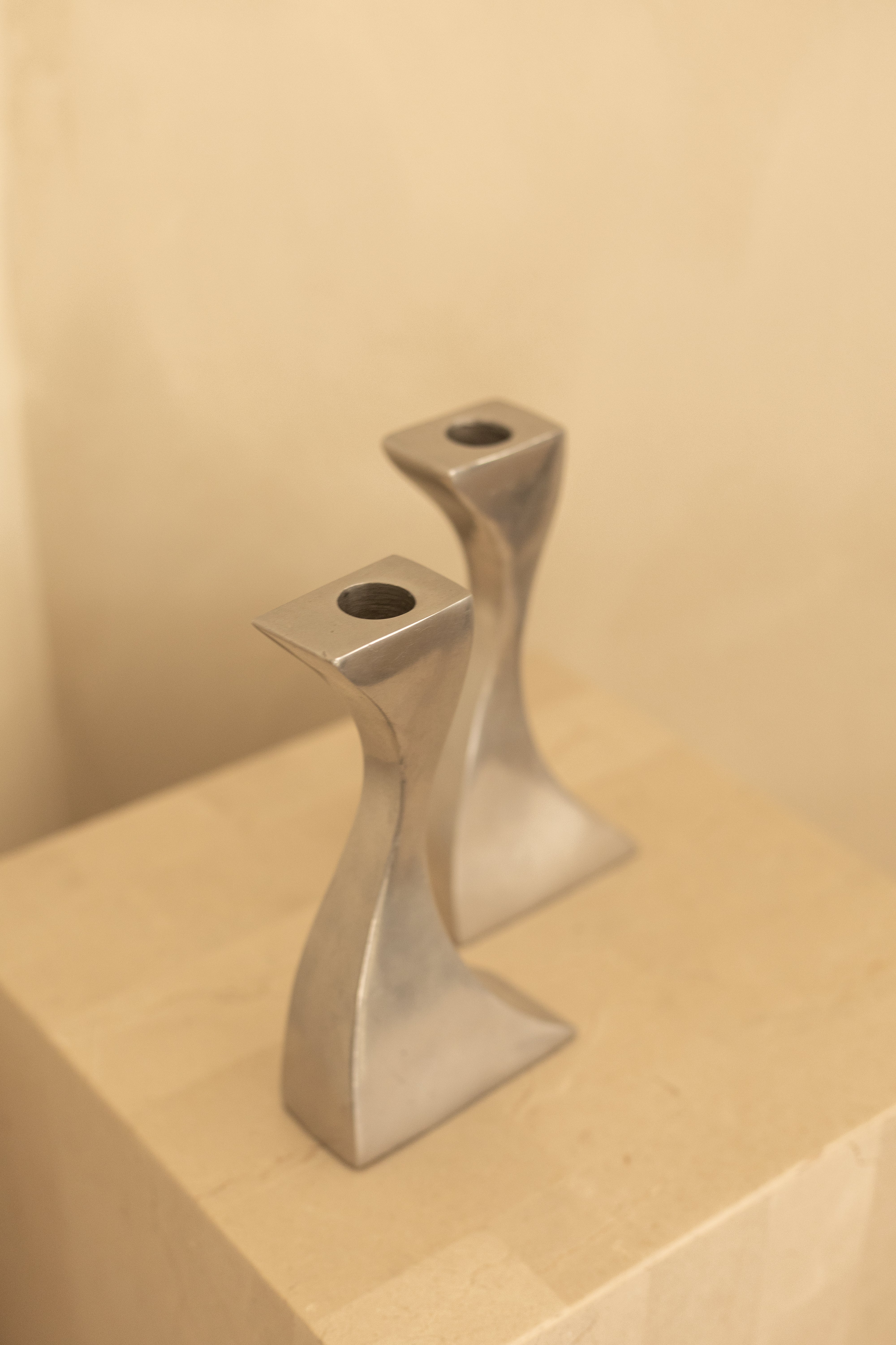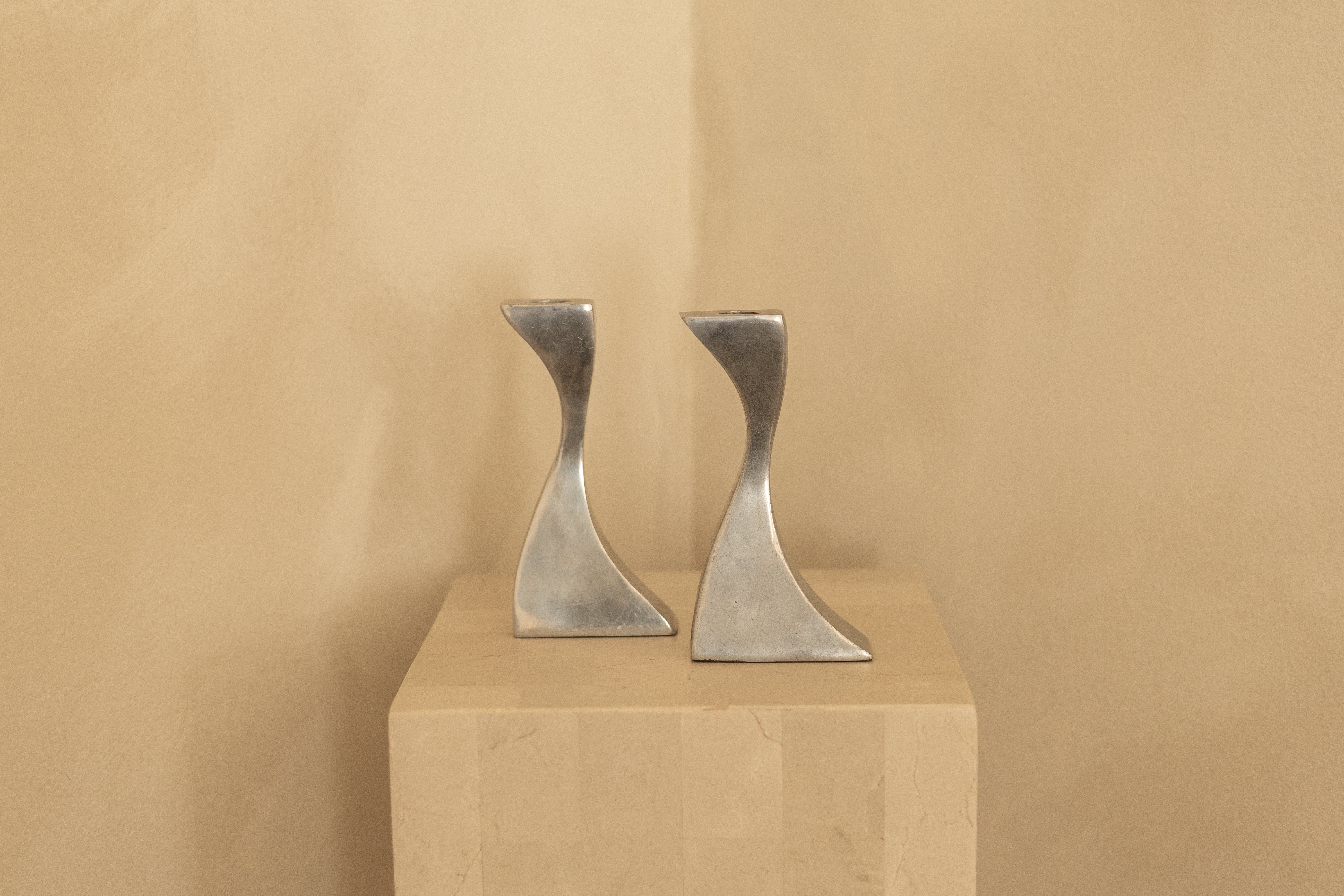 A striking pair of sculptural candlesticks cast in solid metal, defined by their fluid, forward-leaning silhouettes and architectural weight. The gently twisted stems rise from angular bases, creating a sense of movement and balance that feels more like small-scale sculpture than traditional candleholders.
