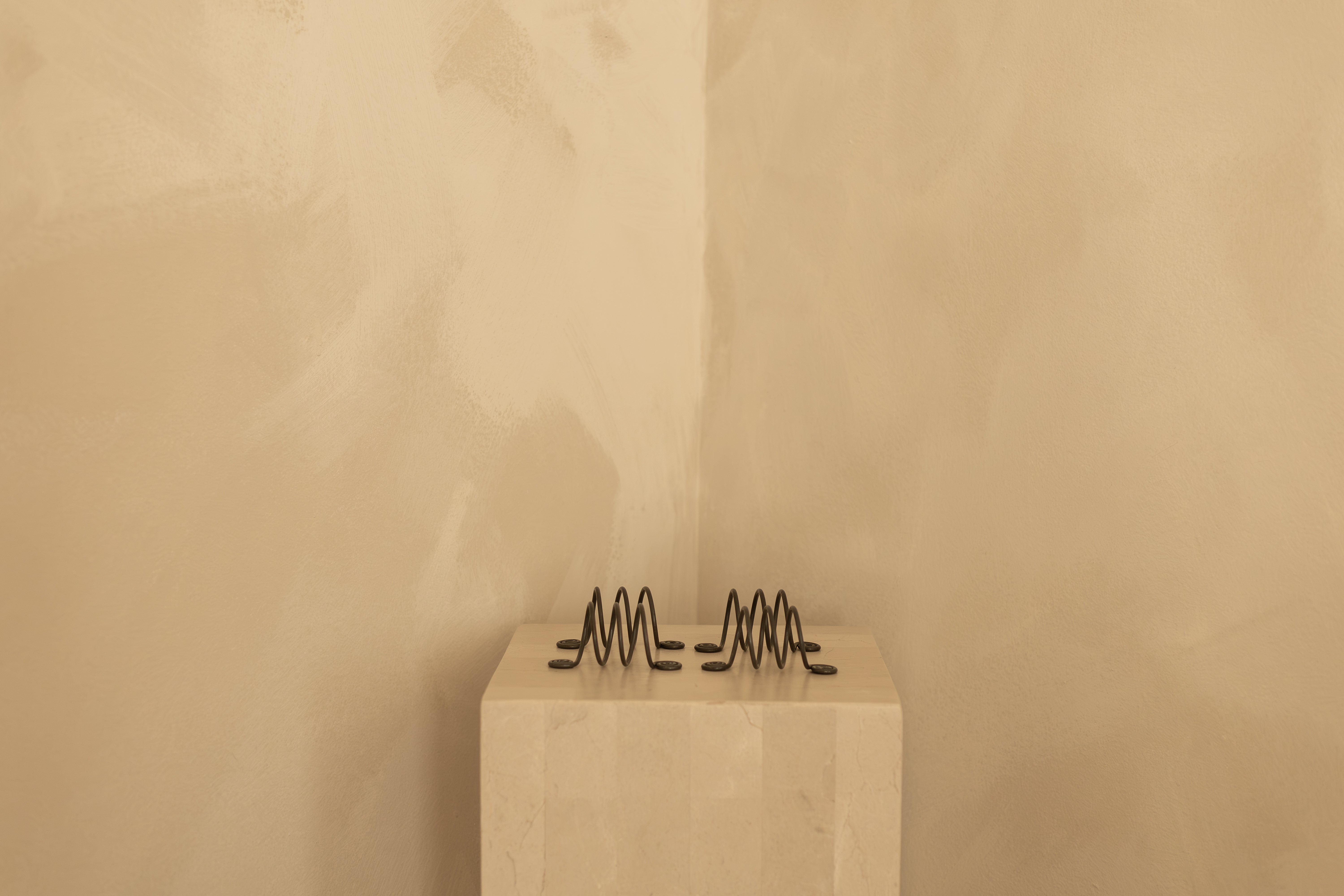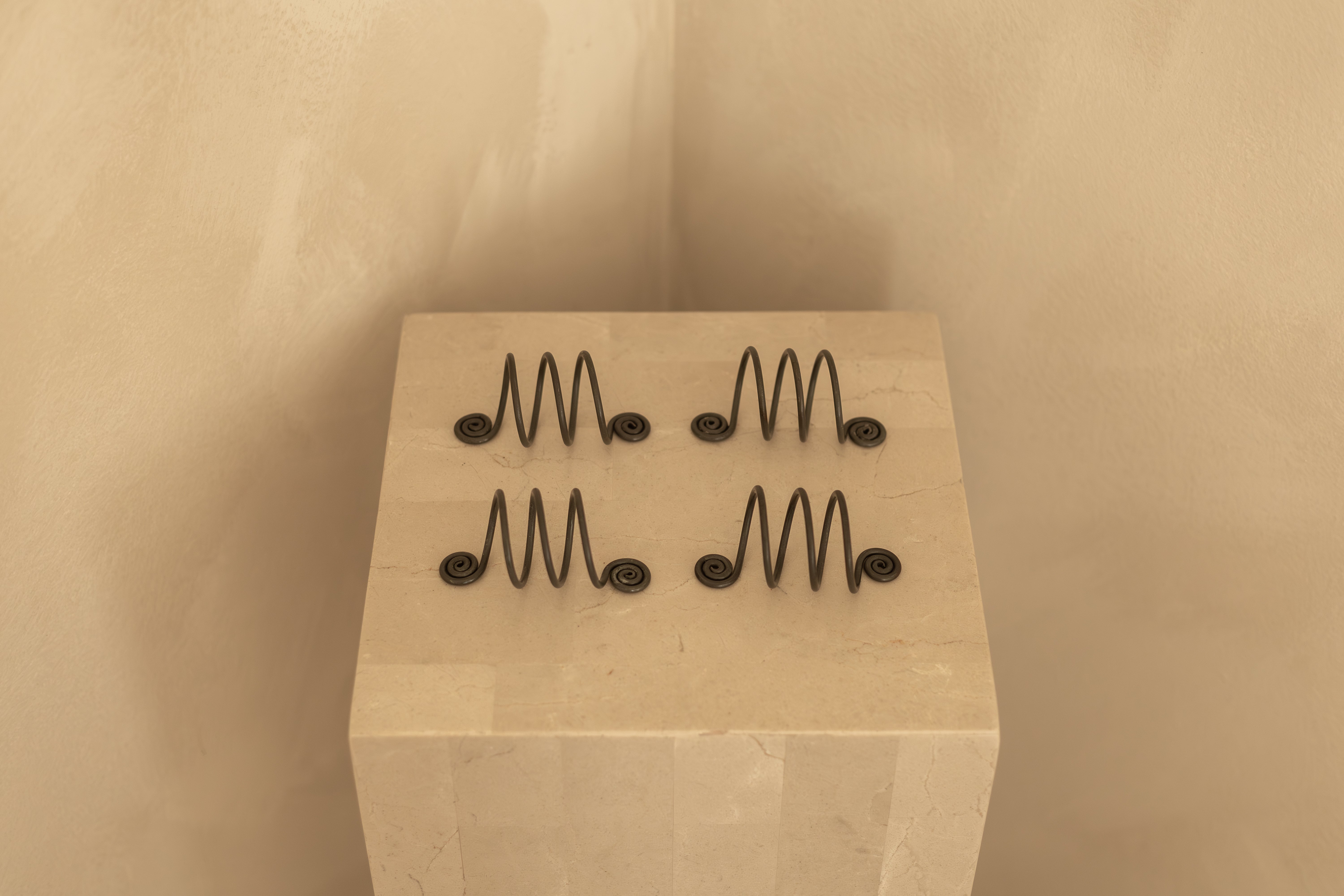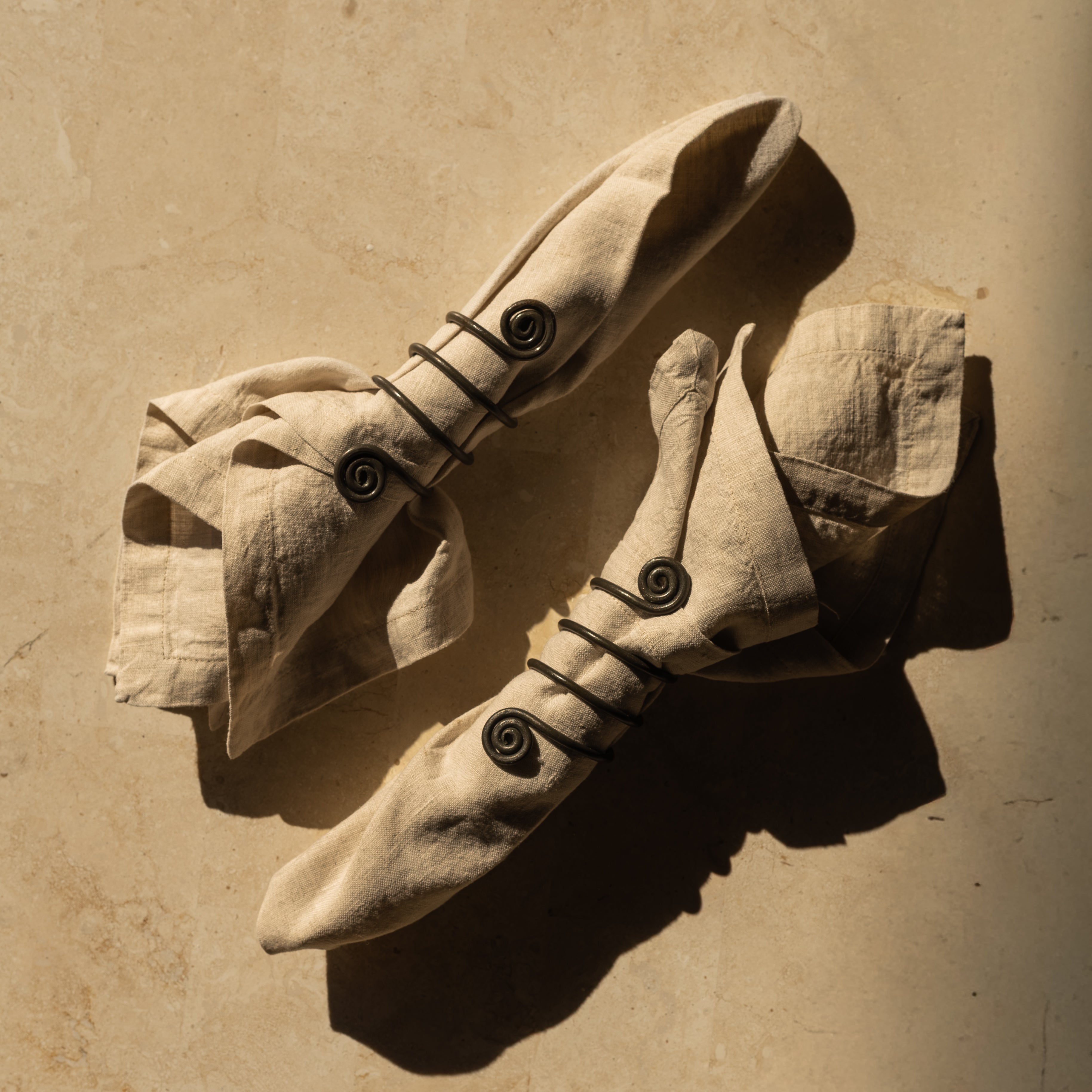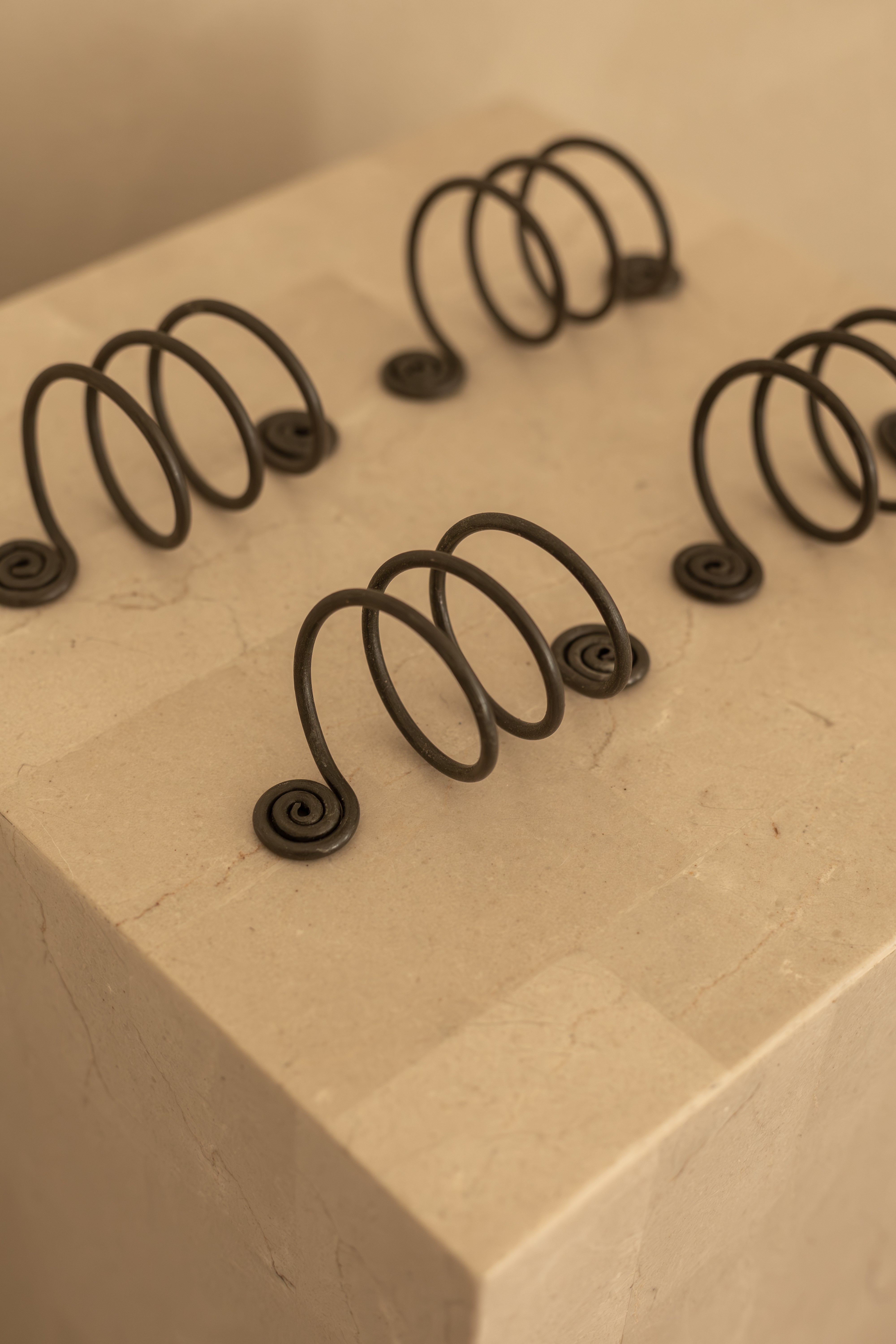 A set of sculptural napkin rings formed from darkened iron, each shaped into a looping spiral with a flattened base that anchors the form. The iron has a natural matte patina, softened through age and handling, giving each piece subtle variation in tone and surface.