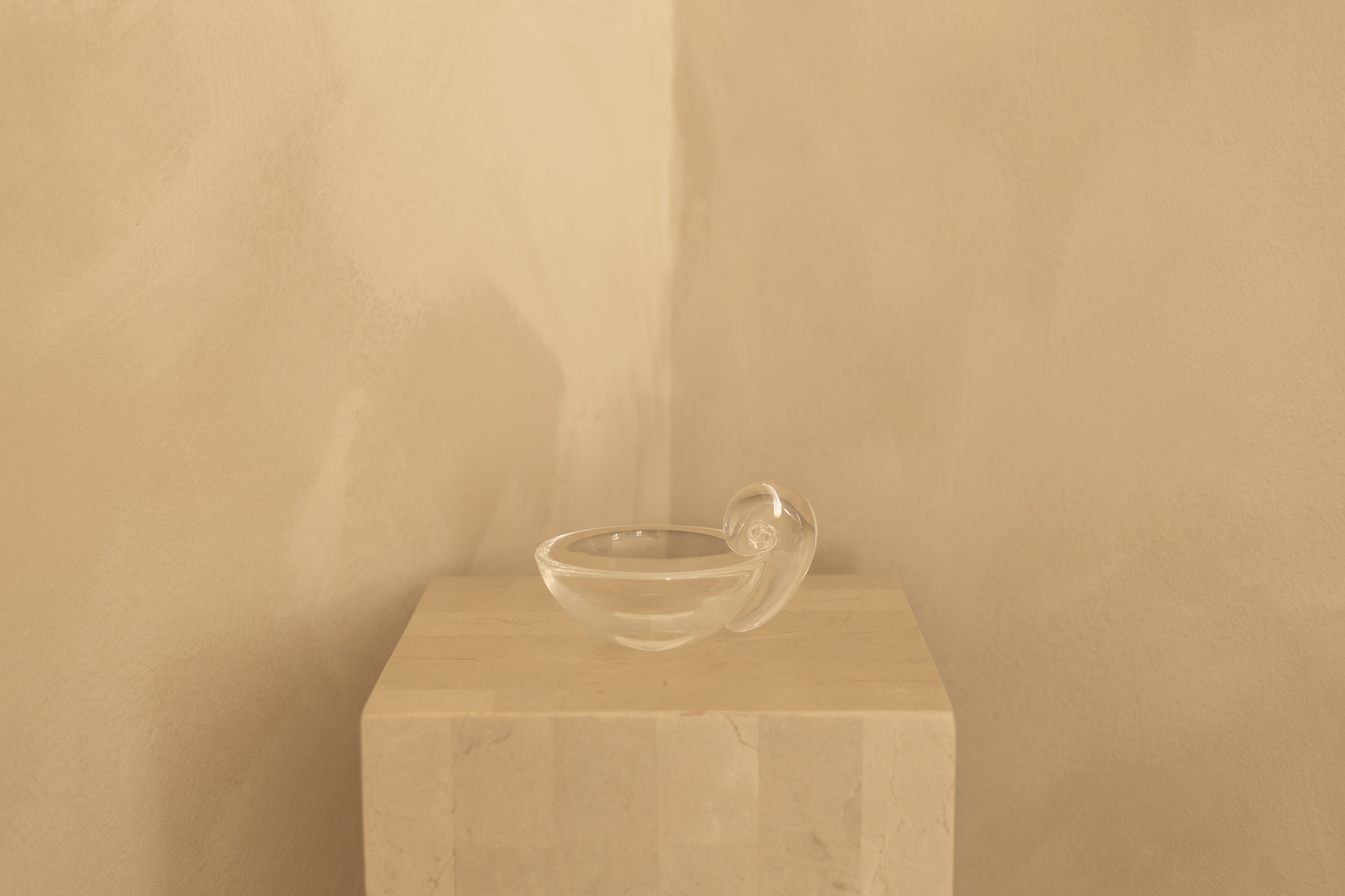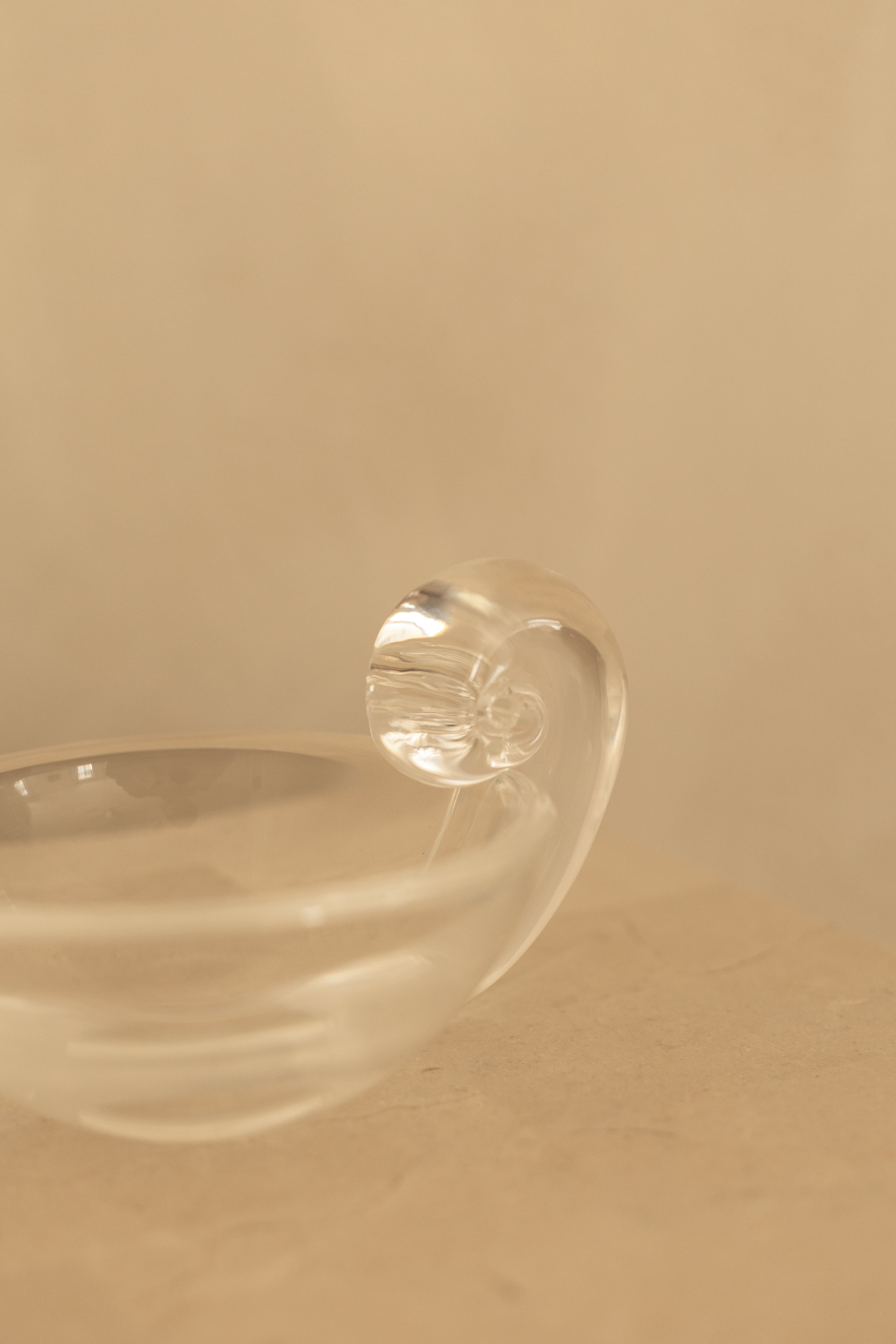 A softly sculptural glass bowl with a fluid, hand-formed curl detail that rests gently against the rim. The form feels intuitive rather than symmetrical — shaped by heat and hand rather than precision.