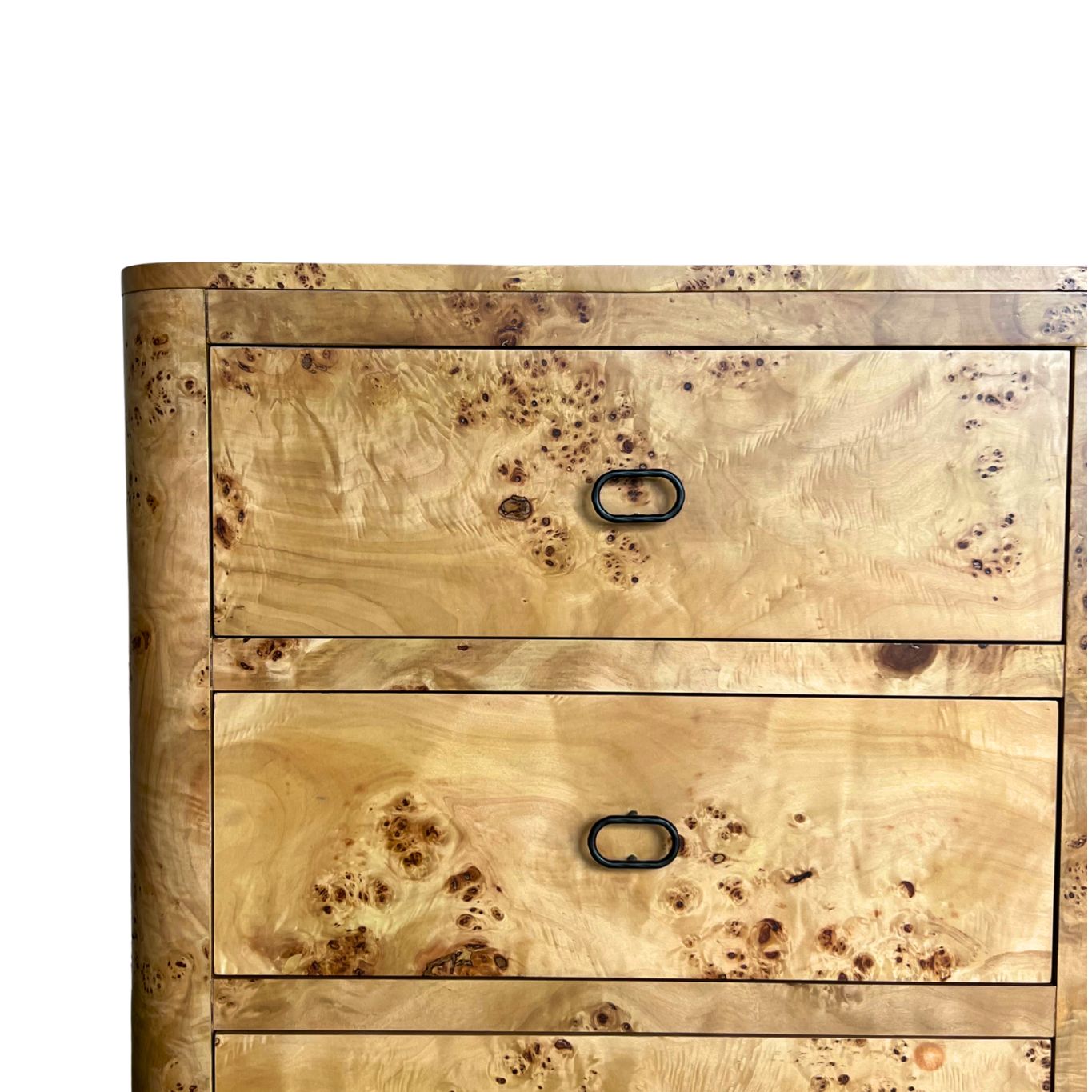 The Zephyr Honey Burl Dresser showcases expressive burl veneer in a warm honey finish, paired with curved corners and enveloped drawer construction. Finished with hammered iron handles, this wooden dresser offers generous storage while maintaining a timeless, old-world aesthetic suited to both modern and classic interiors.