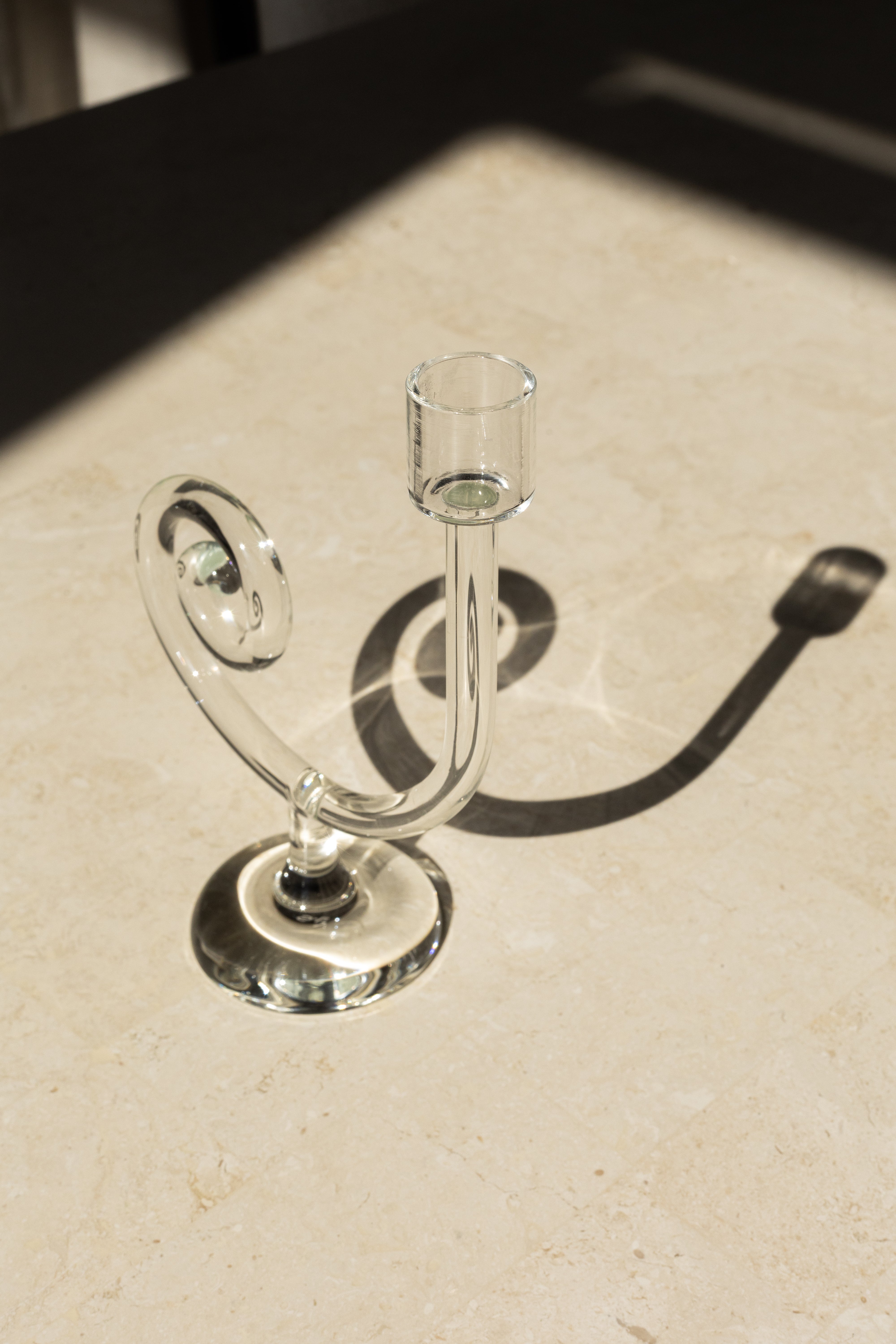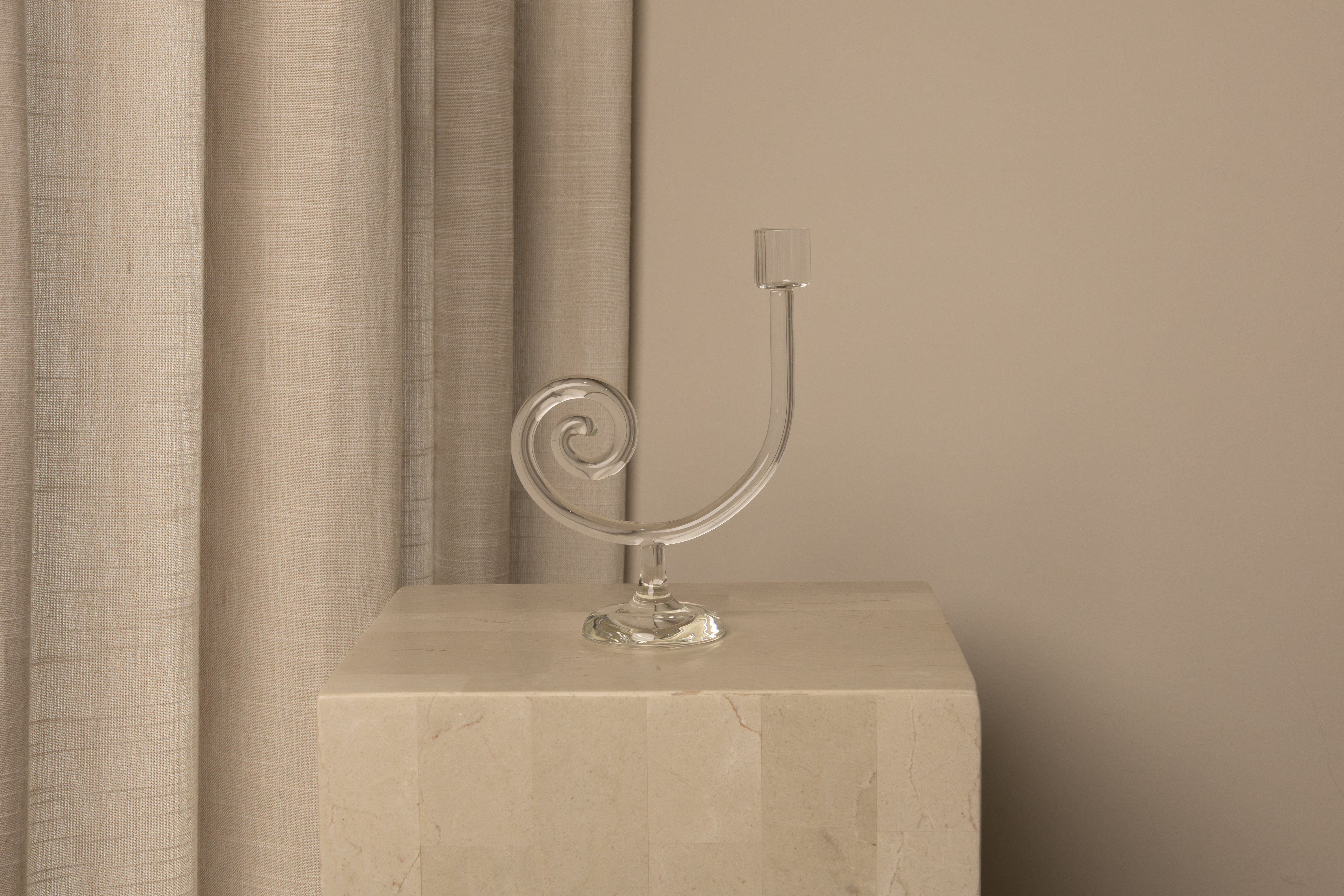 Sophisticated and sculptural, this single stem of glass spirals upward to hold one tall tapered candle. Its spirit evokes a sense of fine, old-world dining and the decorative arts of the 1930s.