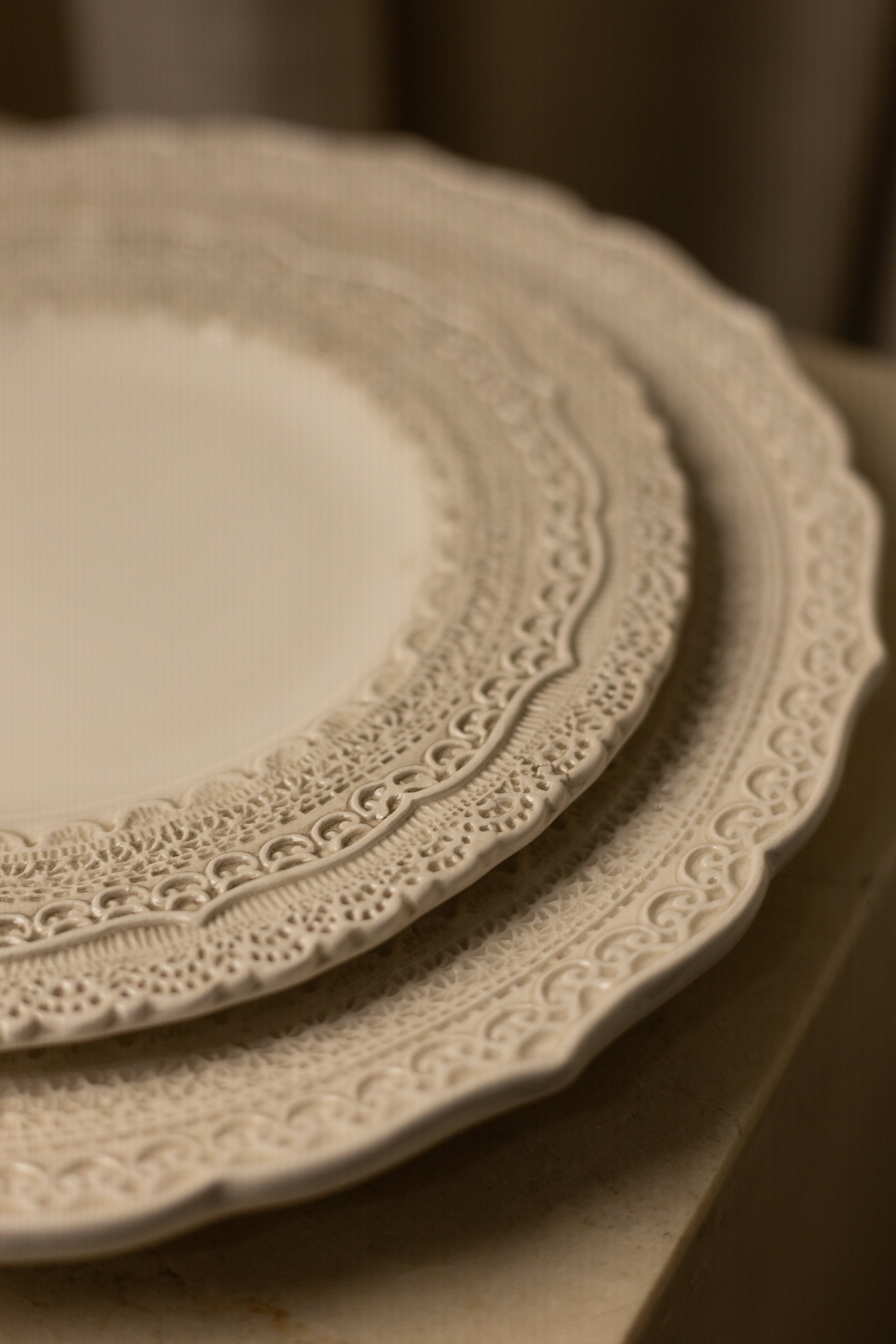 Finezza (meaning "refined") is beloved for its intricate lace design, it is beautiful, durable and easy care. Simple elegance for everyday living. Italian ceramic, handmade in the Veneto region of Italy.