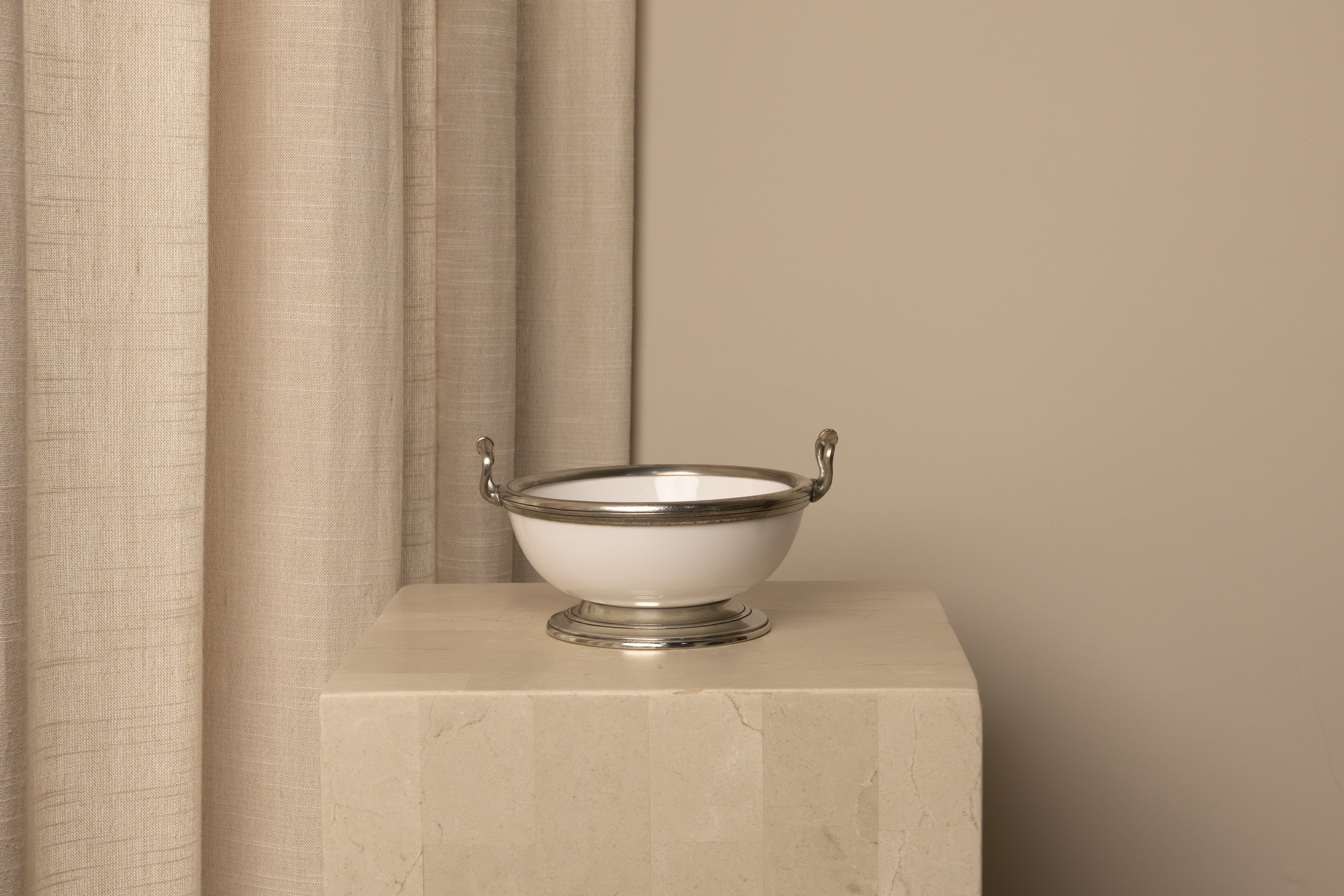 The patina of the hand rubbed pewter against the beautiful bianco white ceramic creates a look (and feel) like none other. Both classic and contemporary, it is truly timeless; and a collection that can be treasured for generations. Handmade by Italian artisans in the province of Brescia.