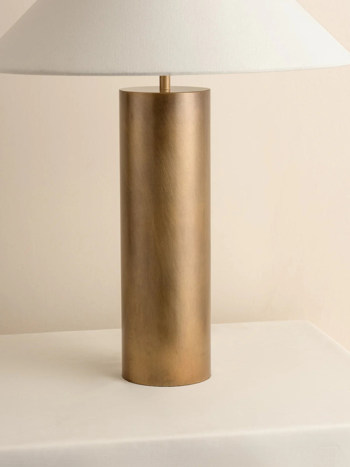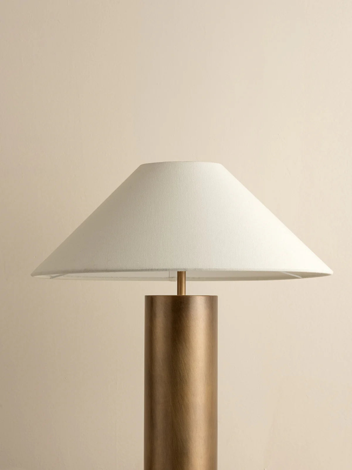 Elegant and timeless. The Bleeker table lamp features an aged brass base which exudes warmth and timeless grandeur. Topped with a wide empire soft linen shade, to diffuse an ambient glow and add a touch of natural elegance, which beautifully complements the minimalist palette of the brass base.