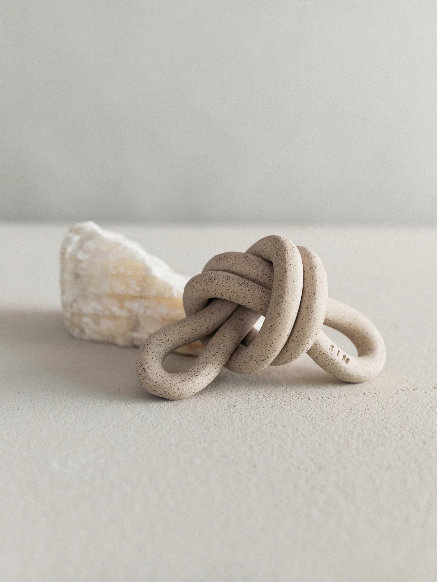 The ornamental Double Loop knot is made out of clay and will serve you well on windy days when papers and napkins cannot be trusted to sit still. It’s also the perfect topper to a stack of books that demand to be adorned.