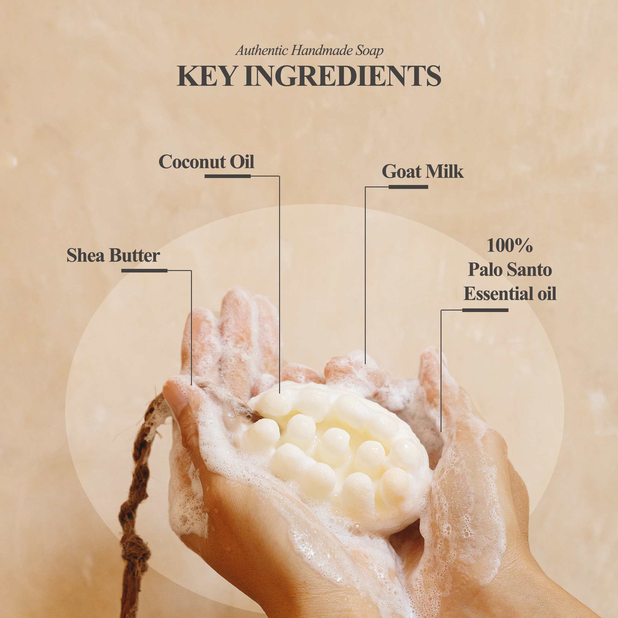 Infused with pure Palo Santo essential oil from Ecuador—calming, grounding, and spiritually purifying. Oval shape fits naturally in the hand for a smooth cleansing experience. Rich in organic shea butter, coconut oil, and goat milk to deeply moisturize and soften skin - Ideal for dry, sensitive, or irritated skin; helps restore skin barrier function.