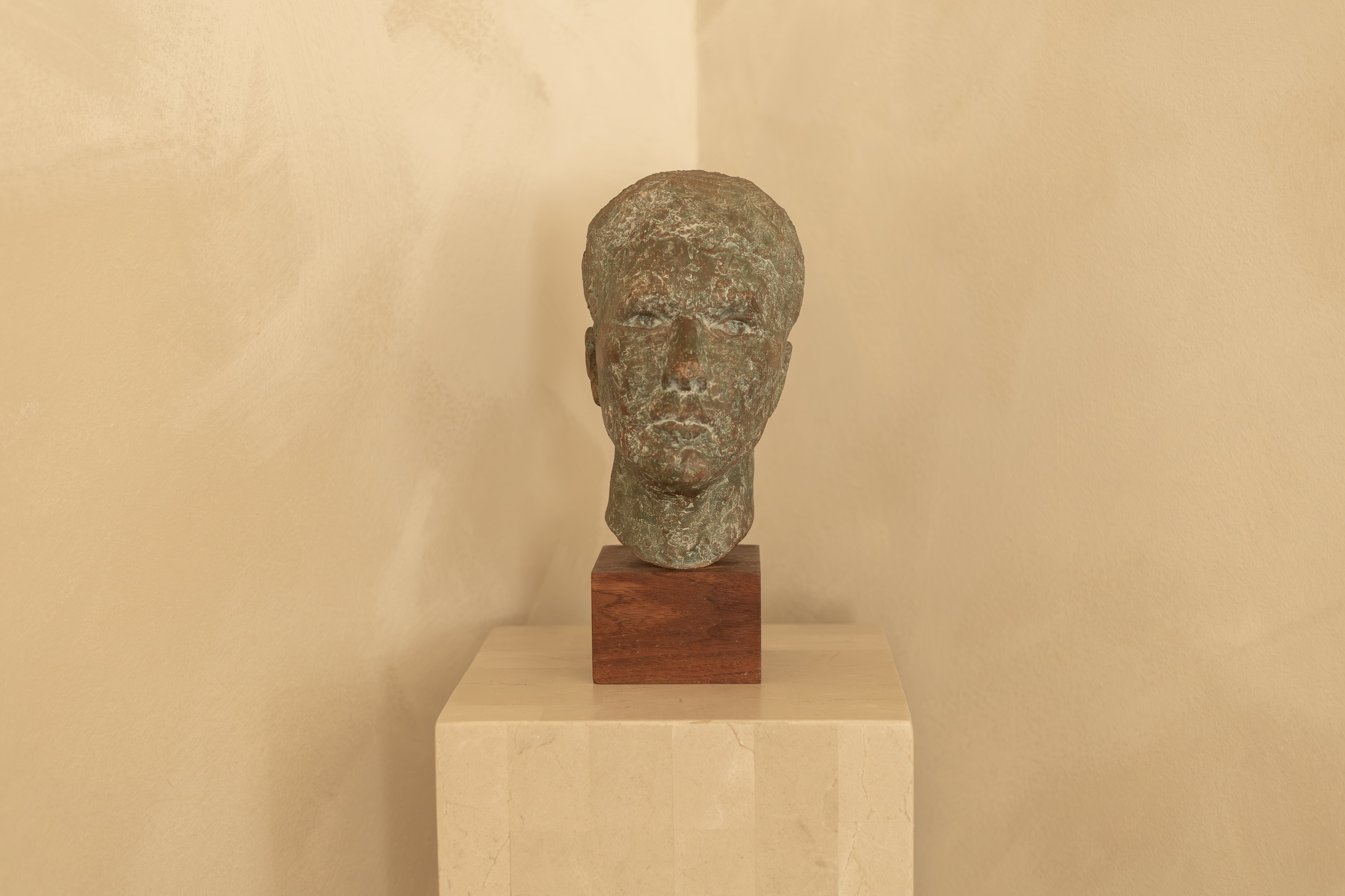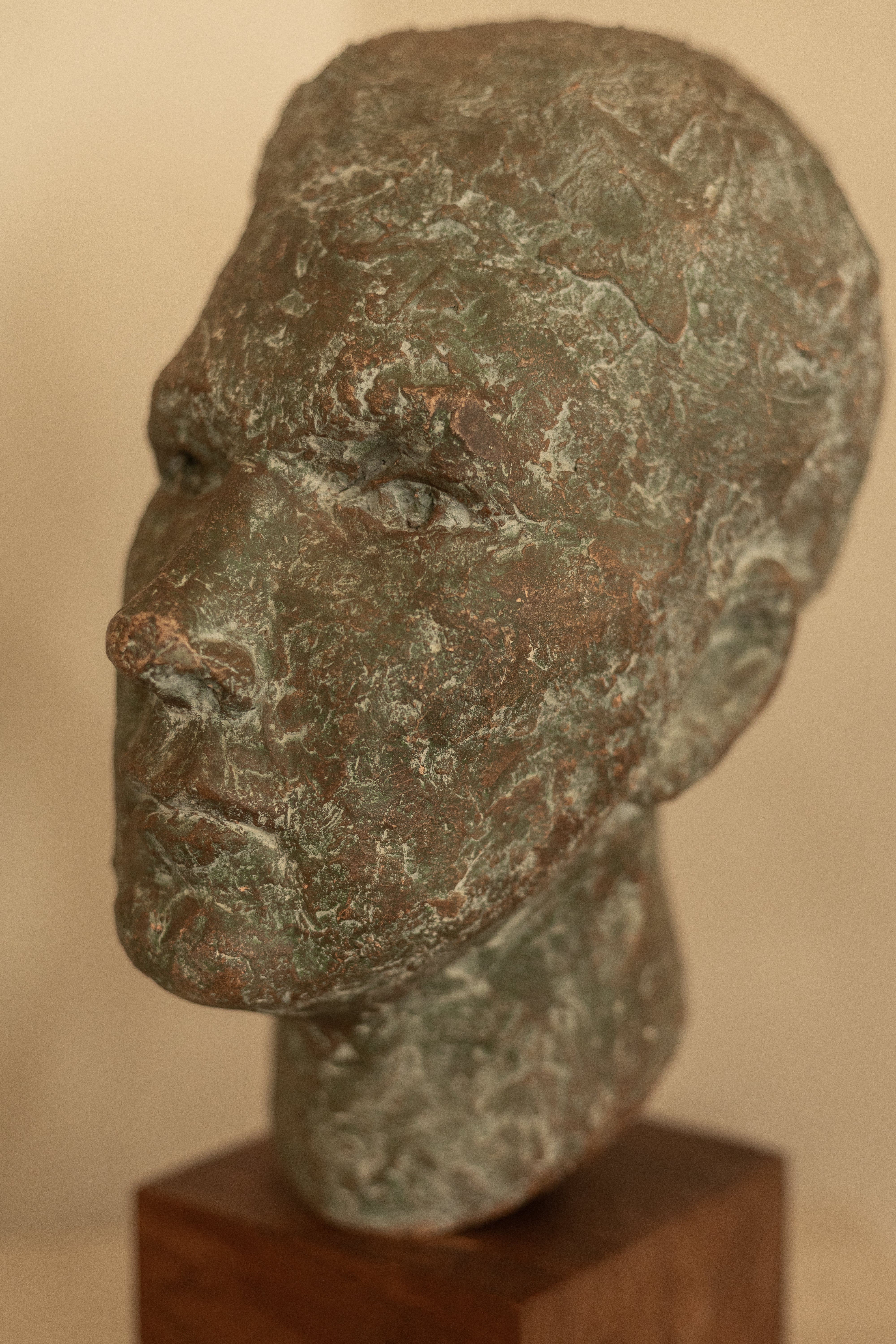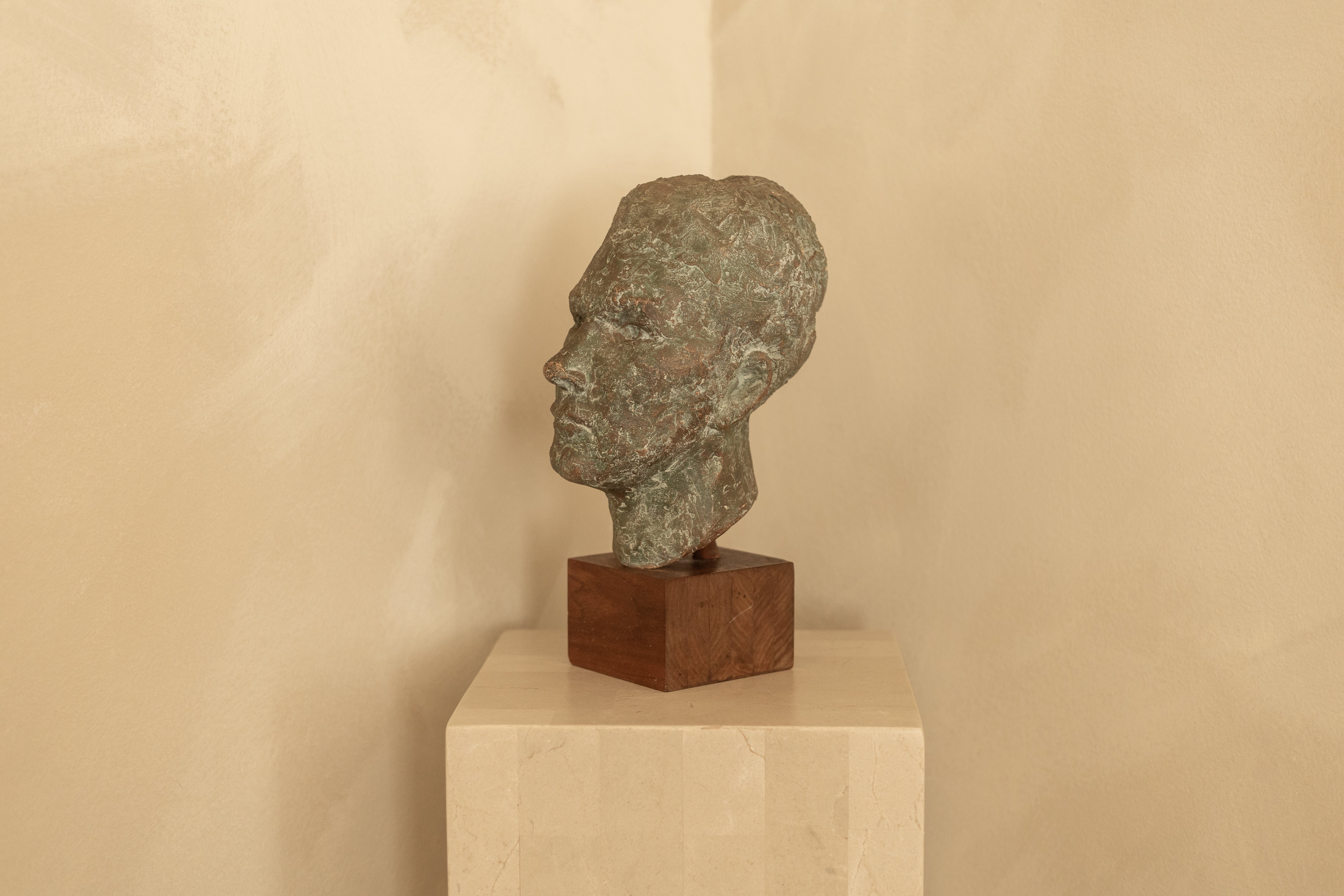 A quietly powerful sculptural head formed in clay and finished with a richly layered patina that evokes aged bronze and stone. The surface is mottled and tactile, with subtle variations in tone and texture that give the piece a sense of time and weather — as though it has been unearthed rather than made.