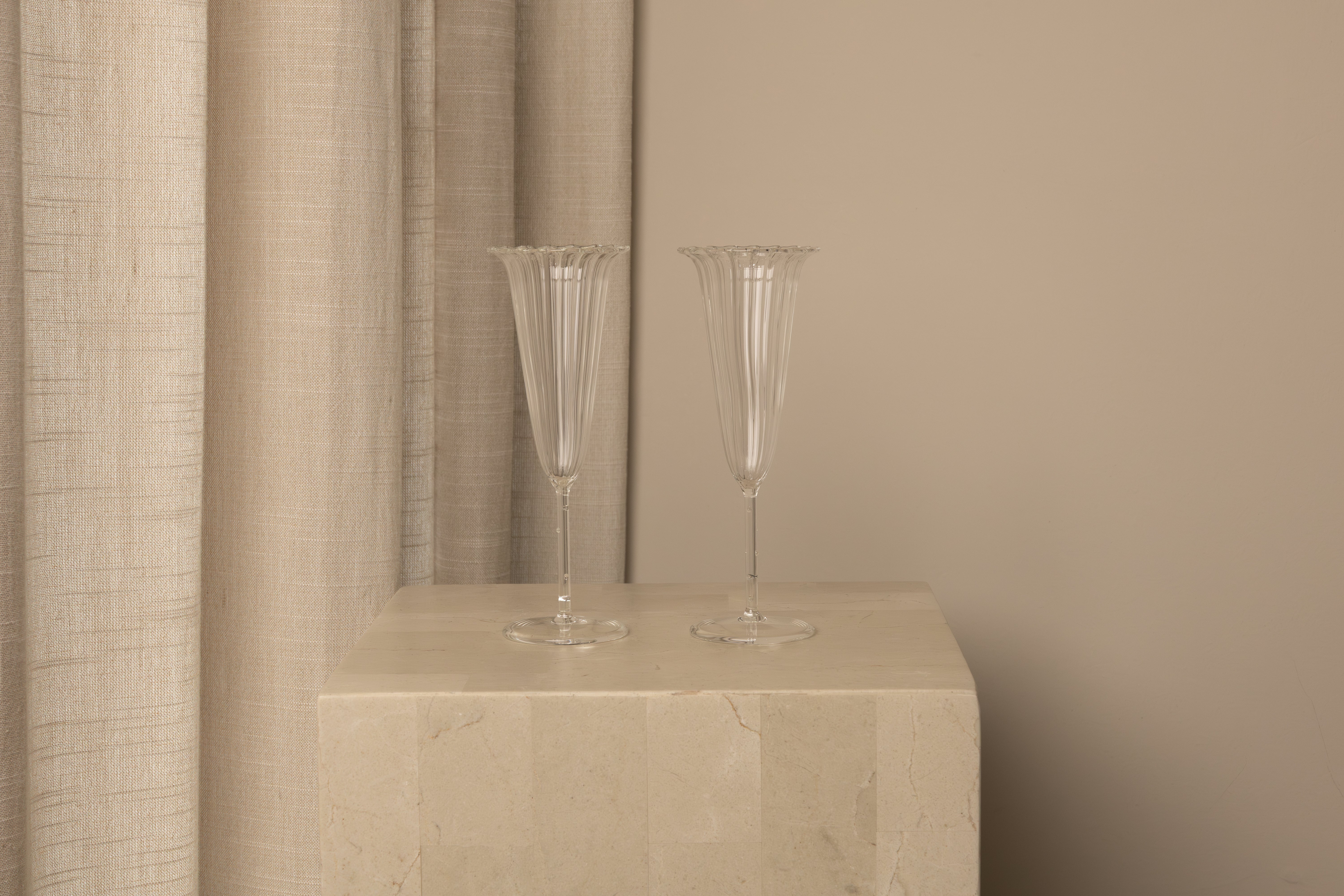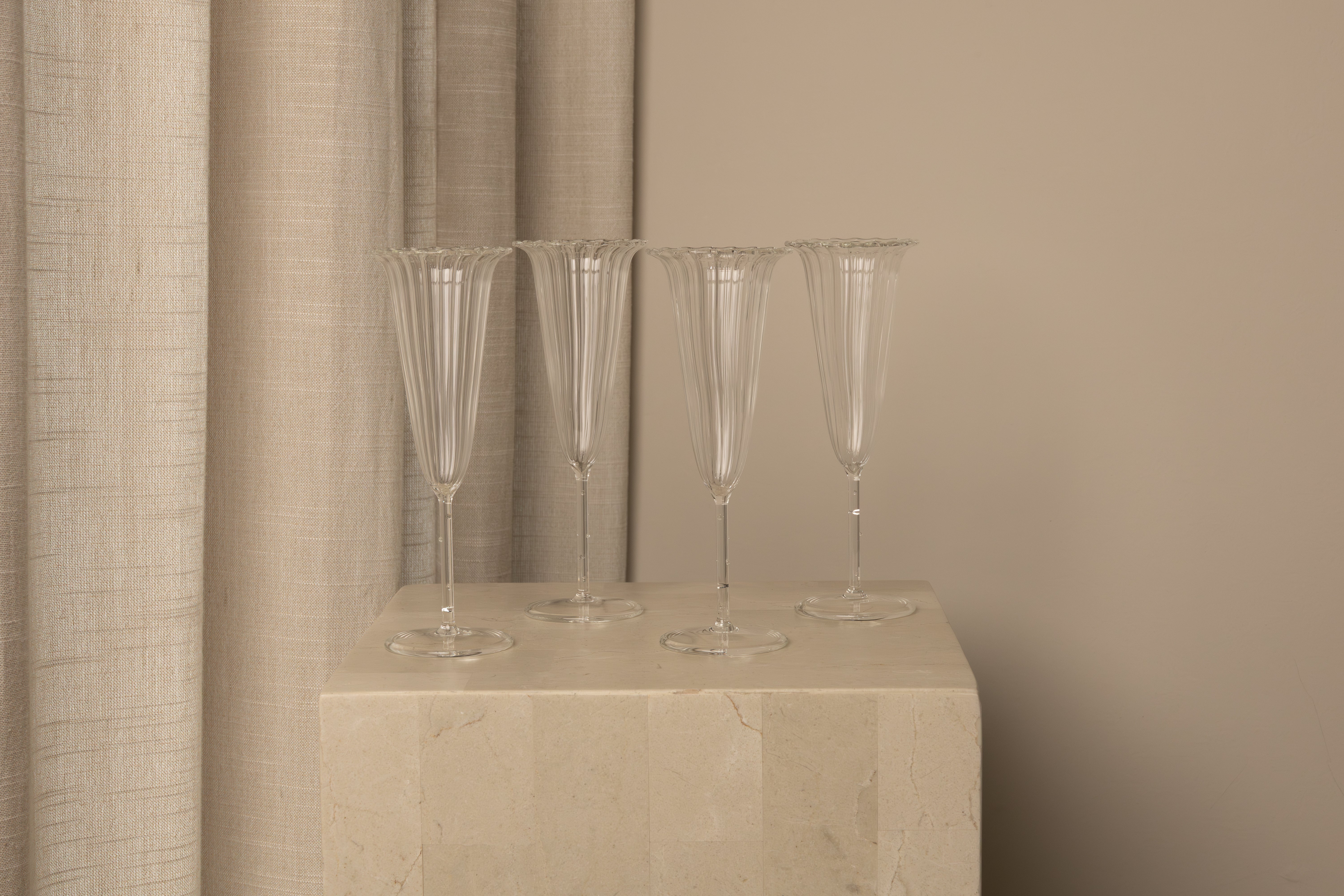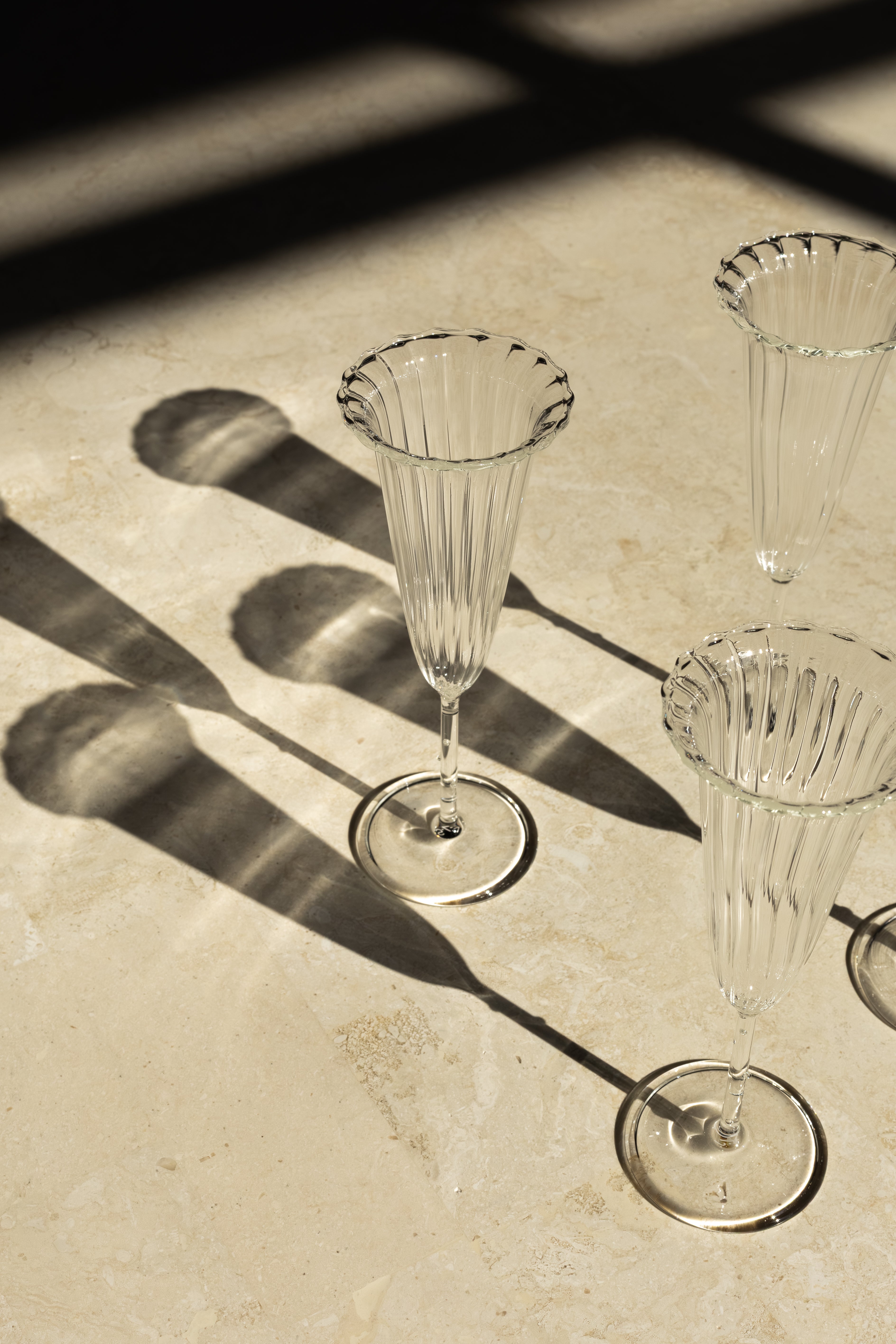 A petite champagne flute, the delicate shape of the cup recalls an Angel Trumpet flower, adding a little touch of magic to an already special drink. Sold as a set of 4. Dimensions: 7–5/8" Tall Capacity: 3.5 oz