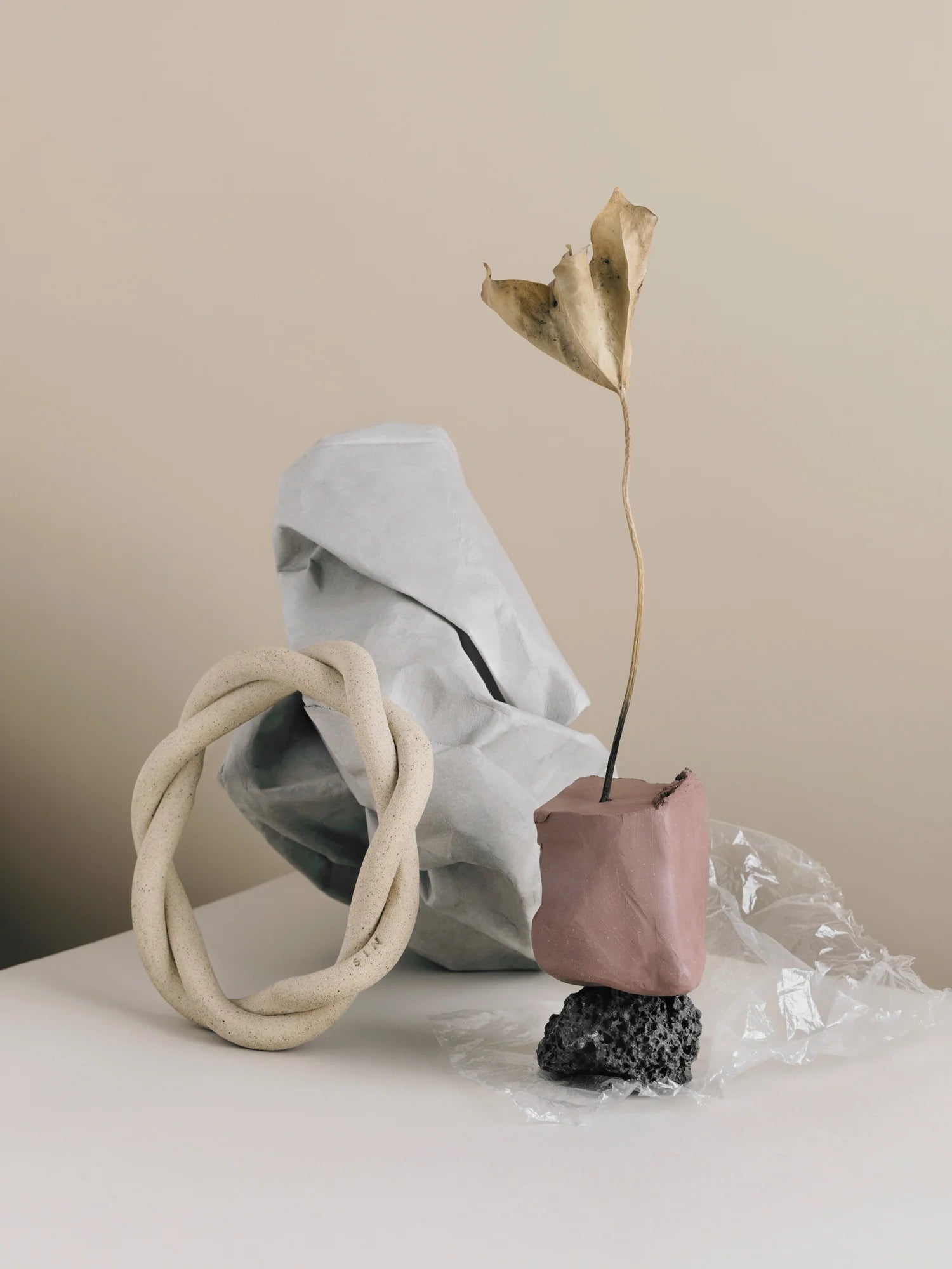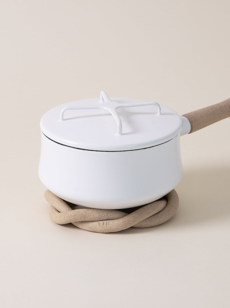 Hand-built with stoneware coils, this twisted irregular circle is an artful way to show your table some respect. Once out from under a pot a pan, this piece also works well as a napkin weight or art object.