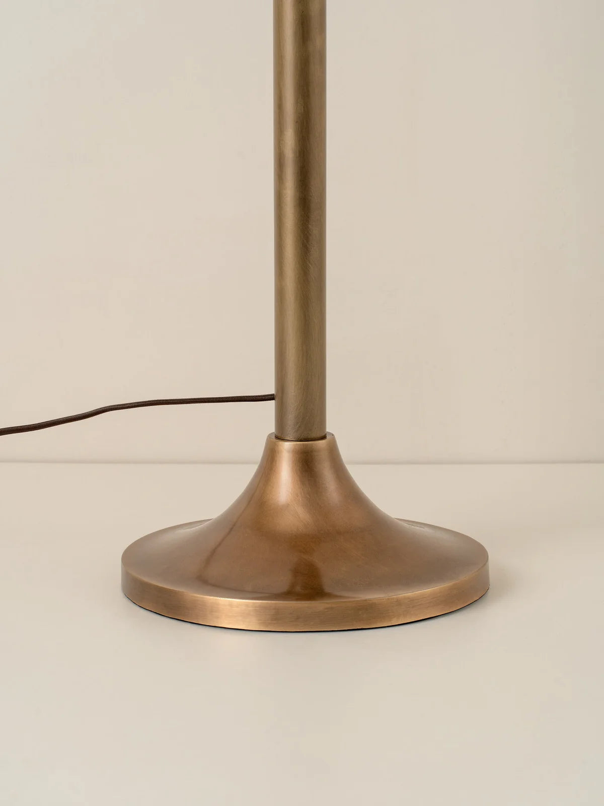 Timeless and elegant. The Ottino floor lamp takes inspiration from the Art-deco movement, featuring a broad aged brass base, meticulously crafted to provide a sturdy and stable foundation and a cascading linen lampshade, gracefully draping down to create a captivating effect. The soft linen shade diffuses light casting an ambient, directional glow.