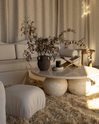 The Miro Collection ensures a neutral aesthetic, calming palette and organic texture suitable for any space. The Miro Chest of Drawers and Miro Side Tables are a harmonious suite or striking when styled individually. The natural fossil stone spheres effortlessly support the pared back form, featuring minimal finger pull drawers in both side table options and chest of drawers.