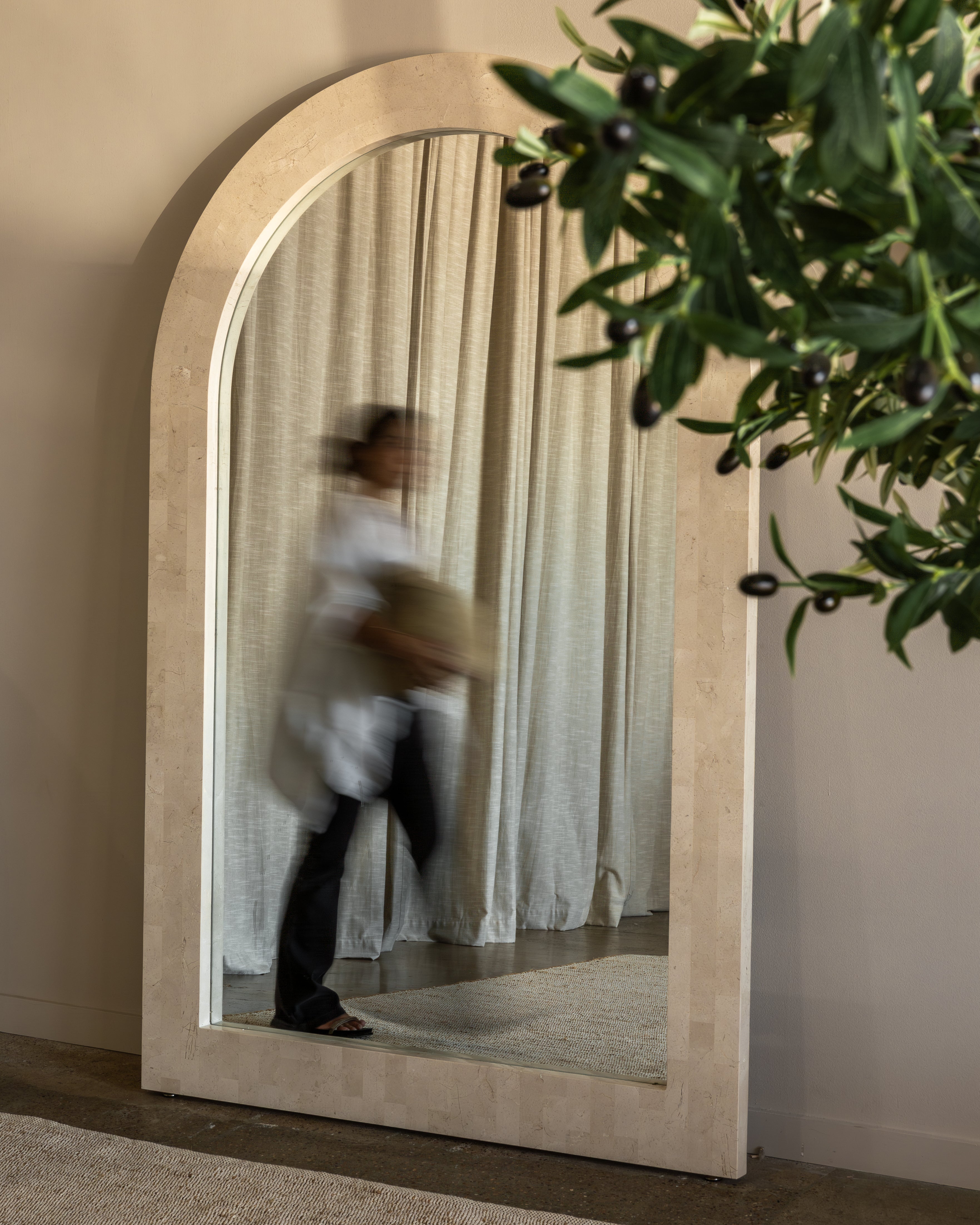 The Esta Floor Mirror, a large statement feature for your space. The Spanish Beige Marble frame creates a bold statement in its appearance whilst the organic profile and medium adds an exploration of shape and dimension.