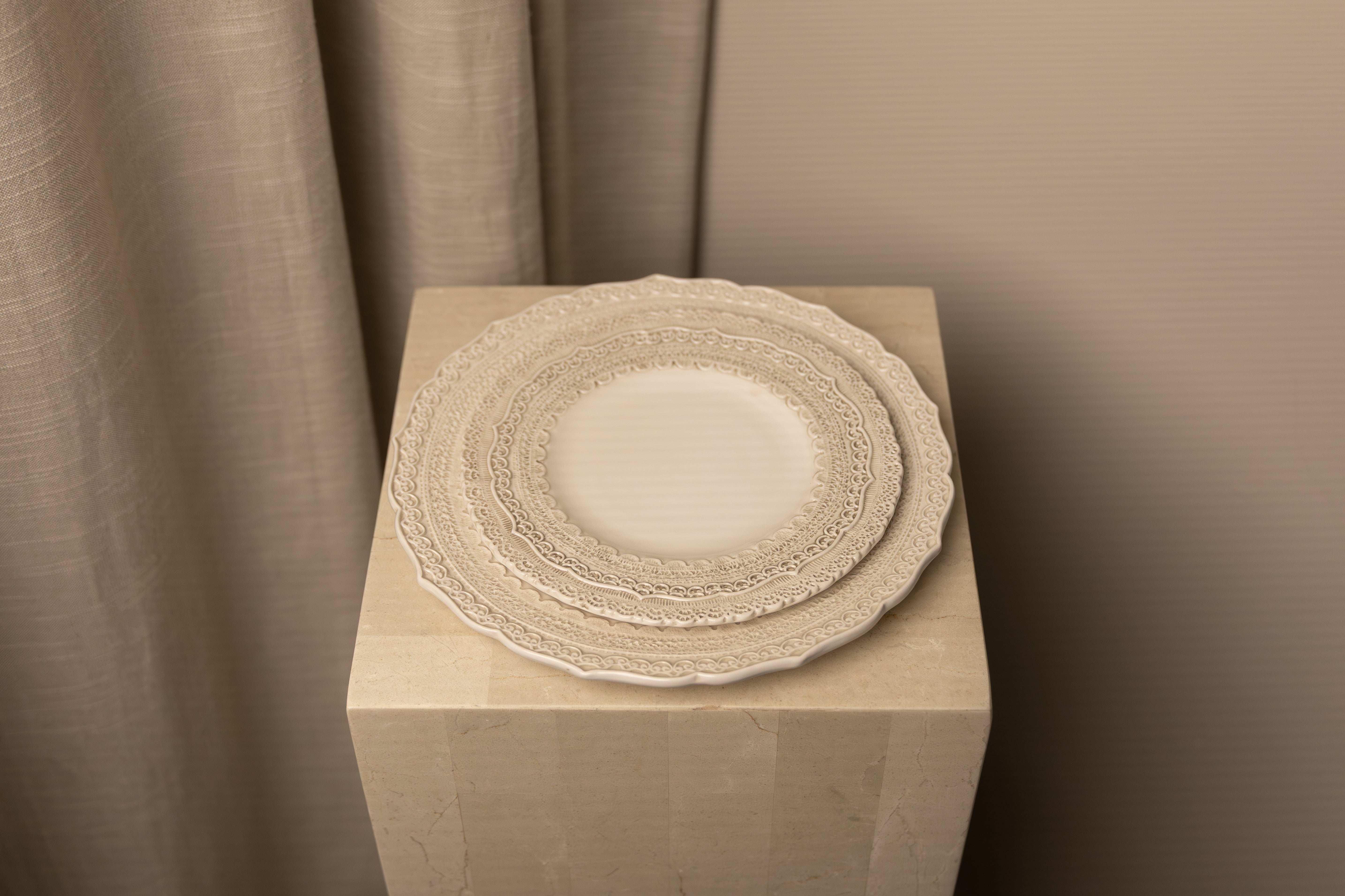 Finezza (meaning "refined") is beloved for its intricate lace design, it is beautiful, durable and easy care. Simple elegance for everyday living. Italian ceramic, handmade in the Veneto region of Italy.