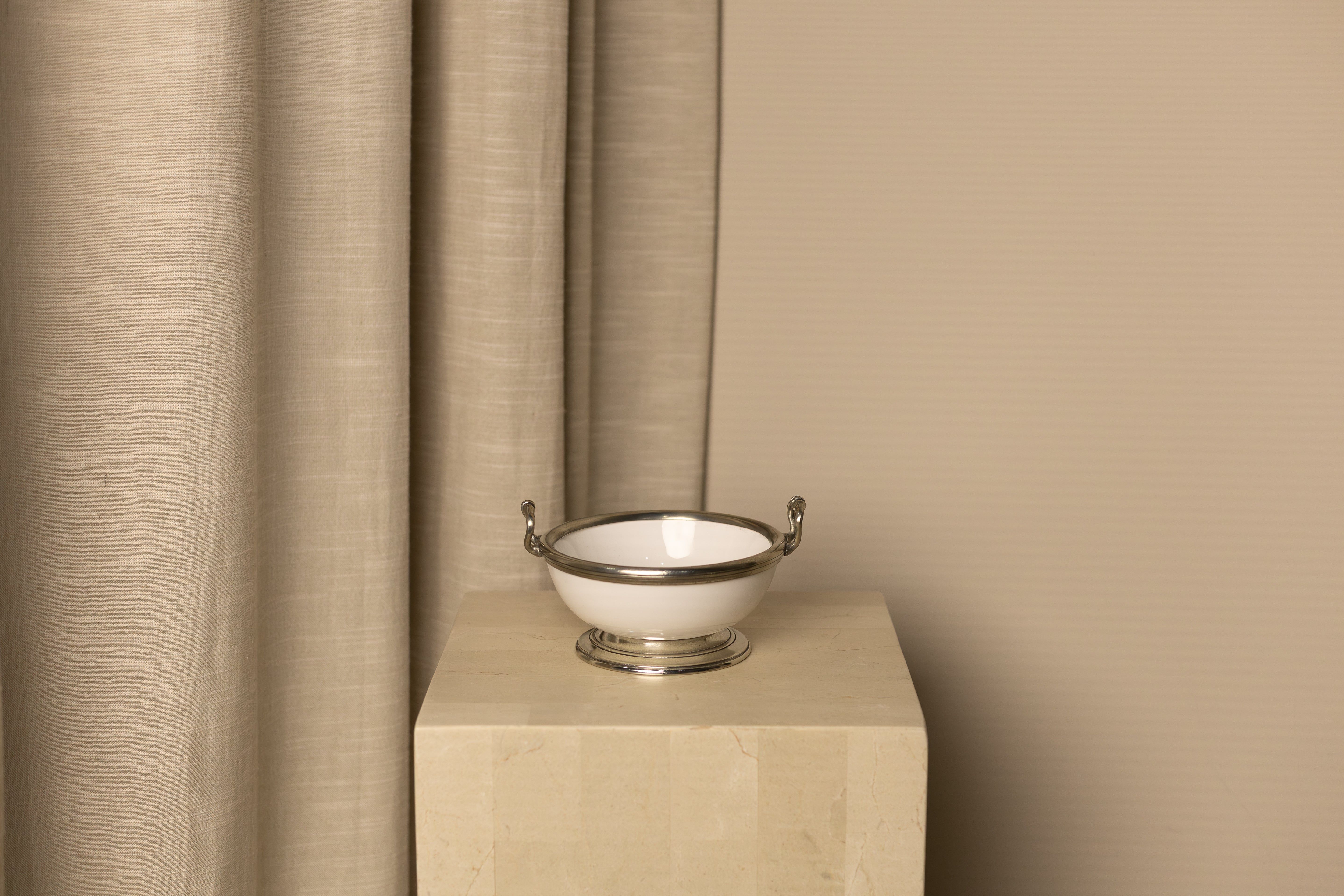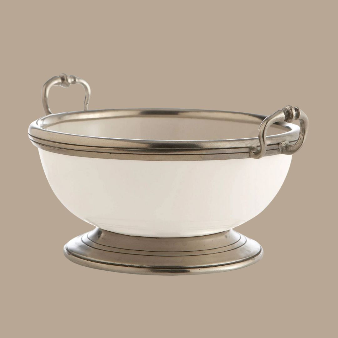 The patina of the hand rubbed pewter against the beautiful bianco white ceramic creates a look (and feel) like none other. Both classic and contemporary, it is truly timeless; and a collection that can be treasured for generations. Handmade by Italian artisans in the province of Brescia.
