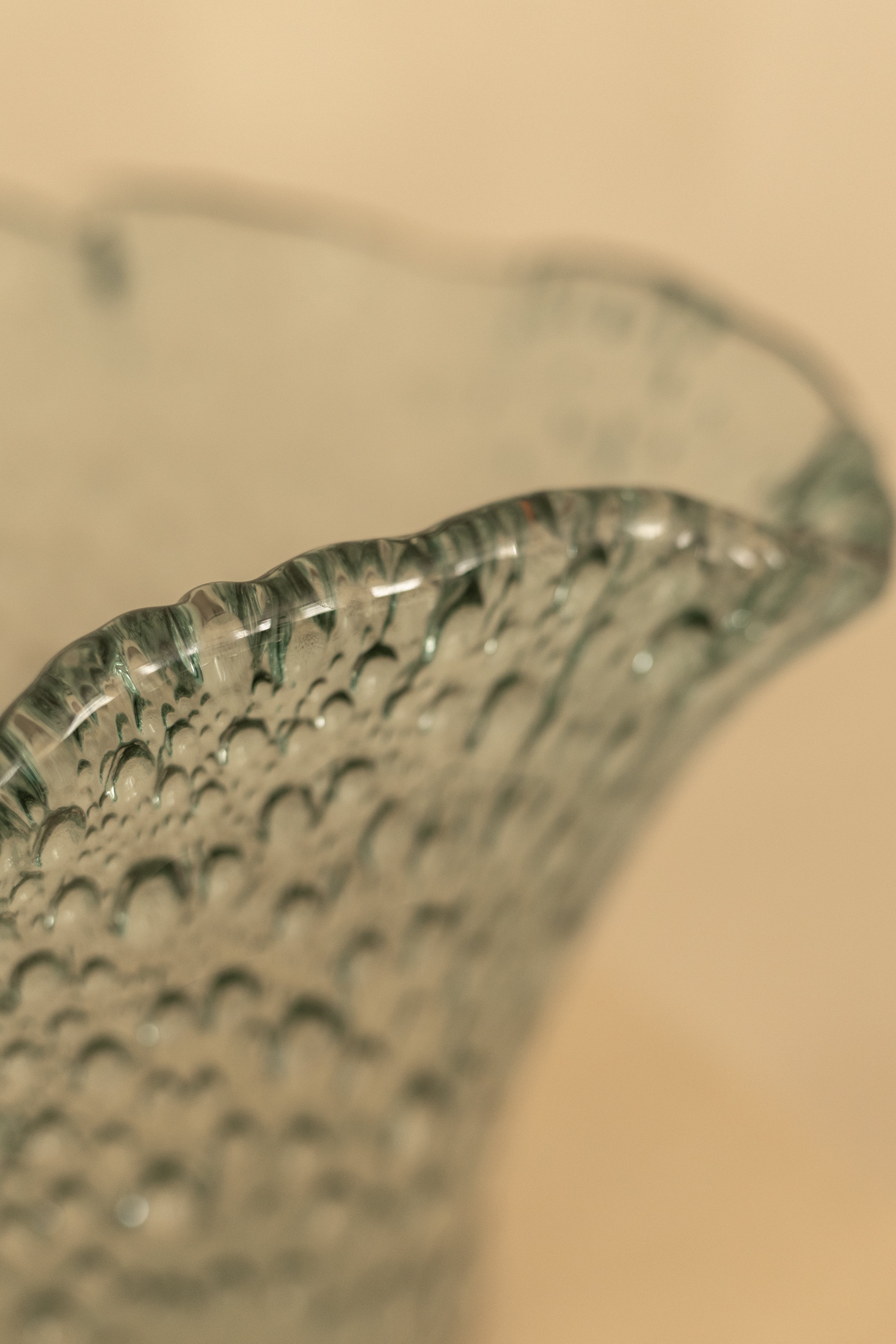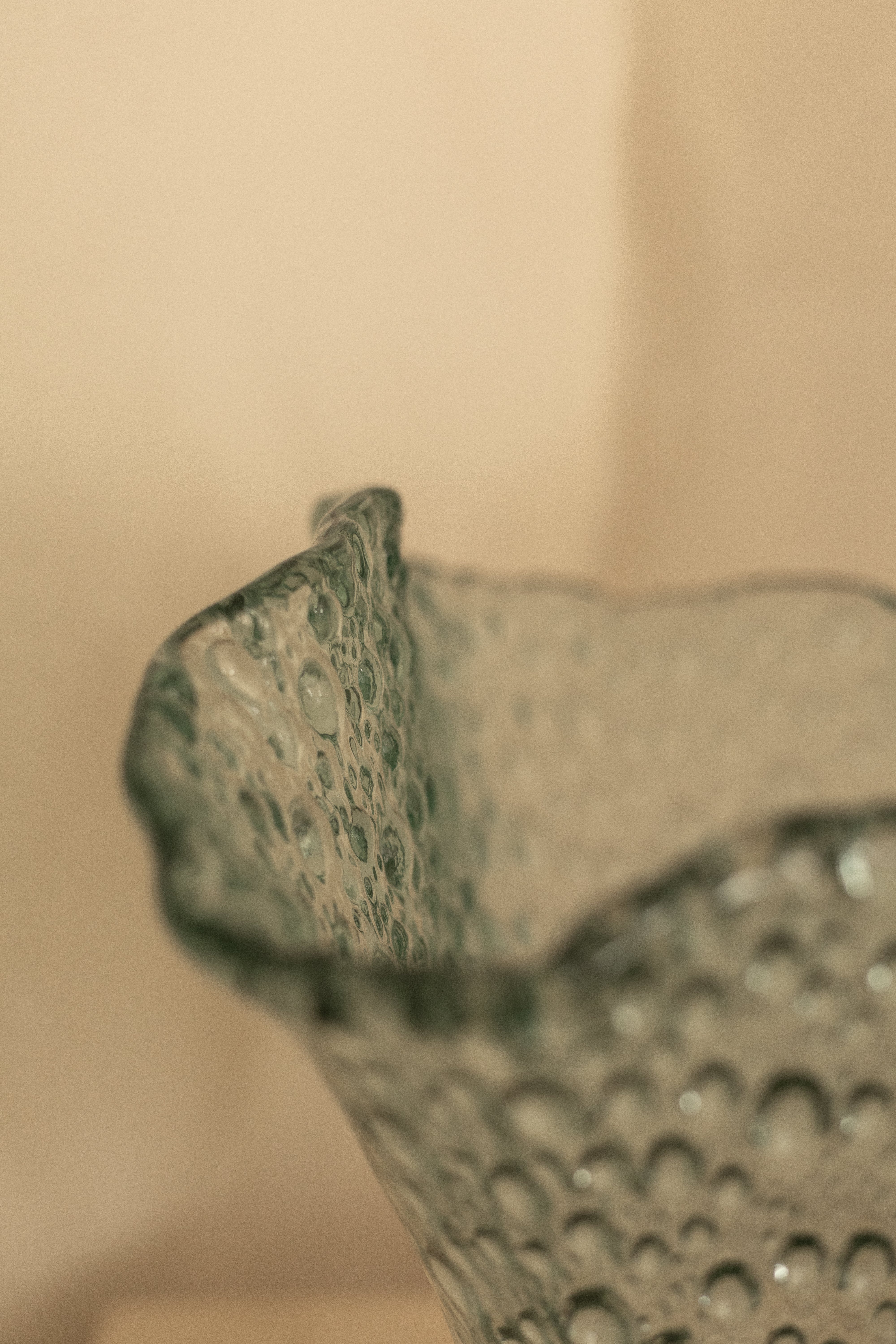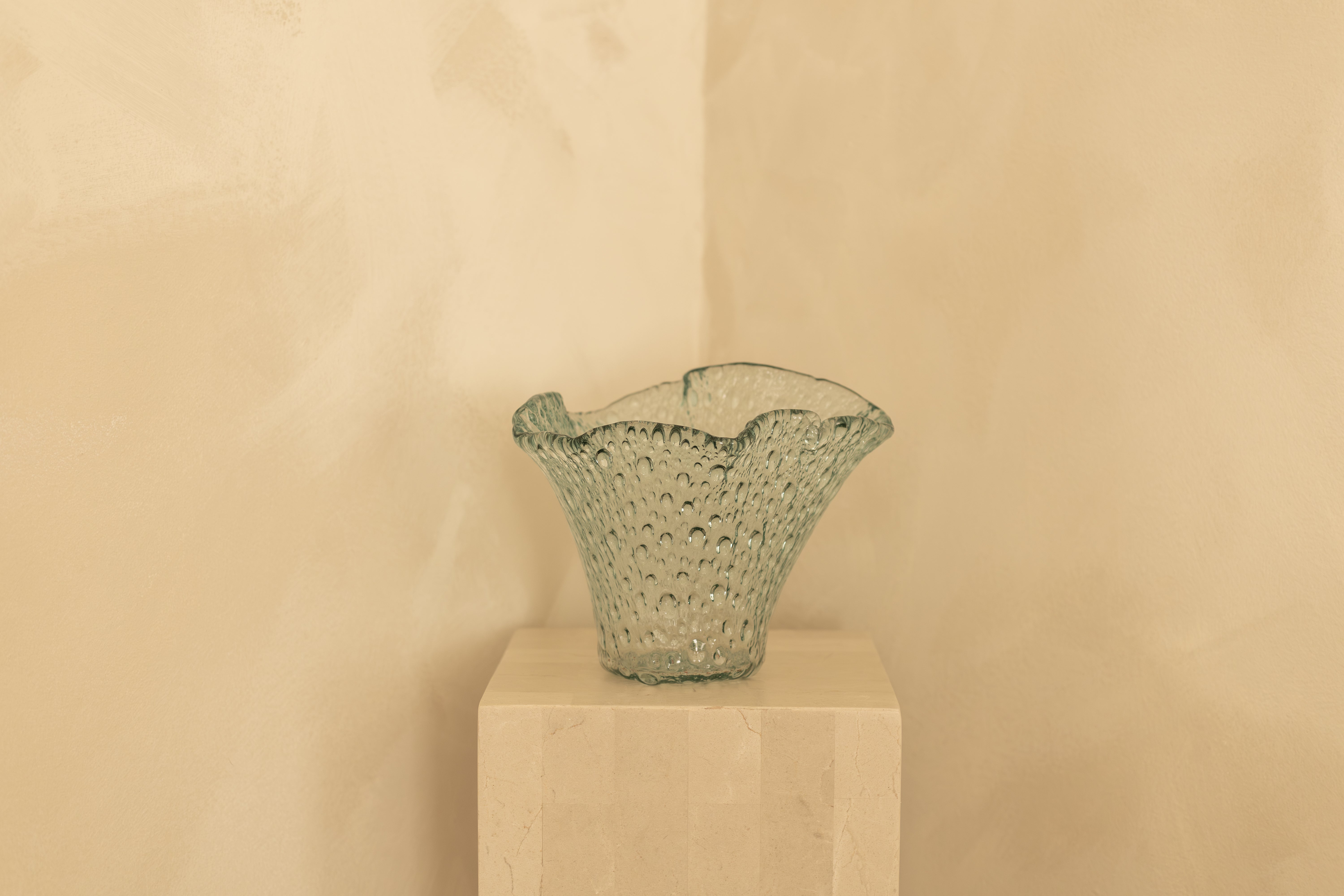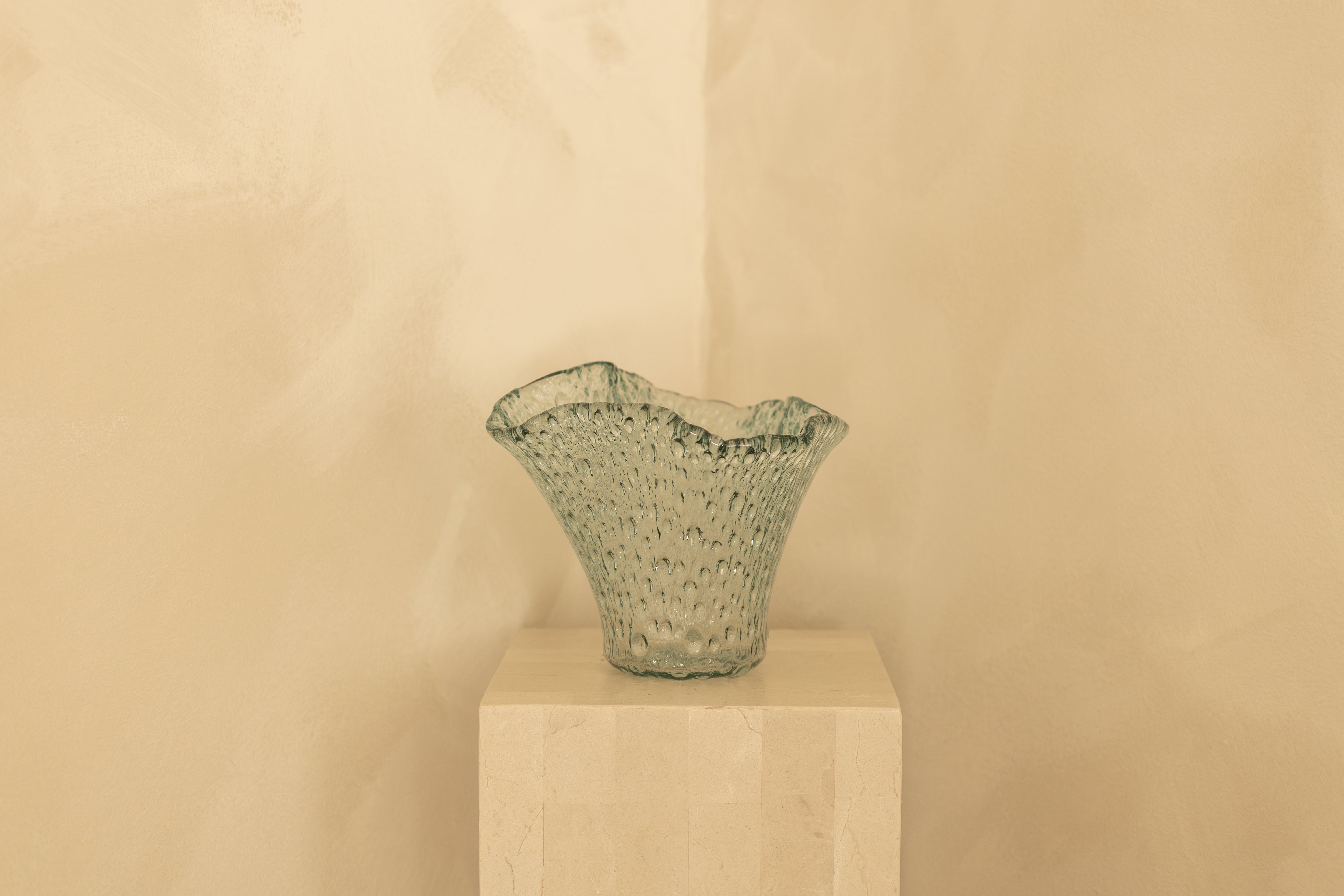 The bubble texture is created using a centuries-old glassmaking technique where air is intentionally trapped inside molten glass as it is shaped, forming a constellation of tiny pockets suspended within the surface. Each vase carries its own subtle variations, a reminder that it was formed by breath, heat and movement rather than by machine.