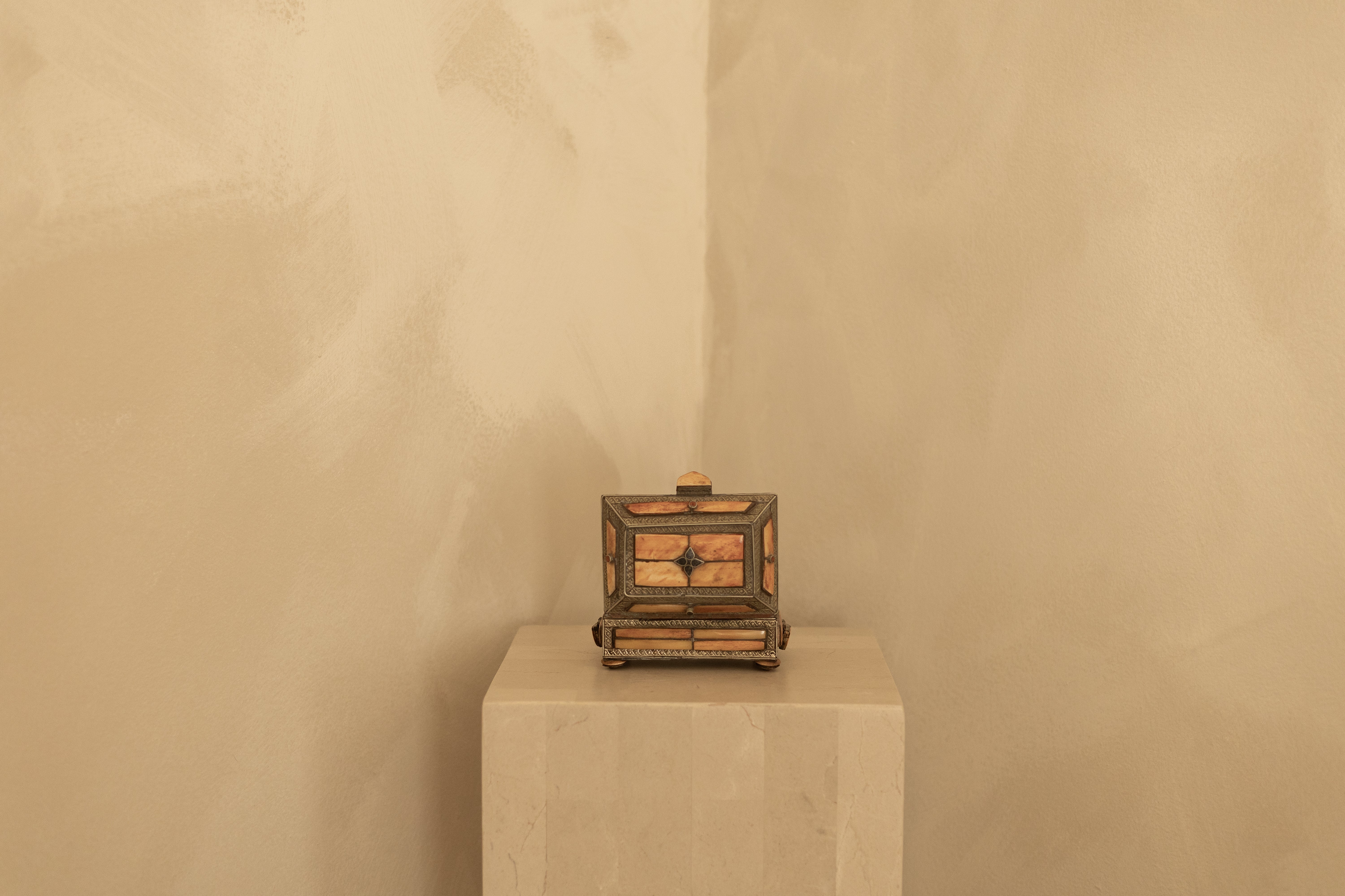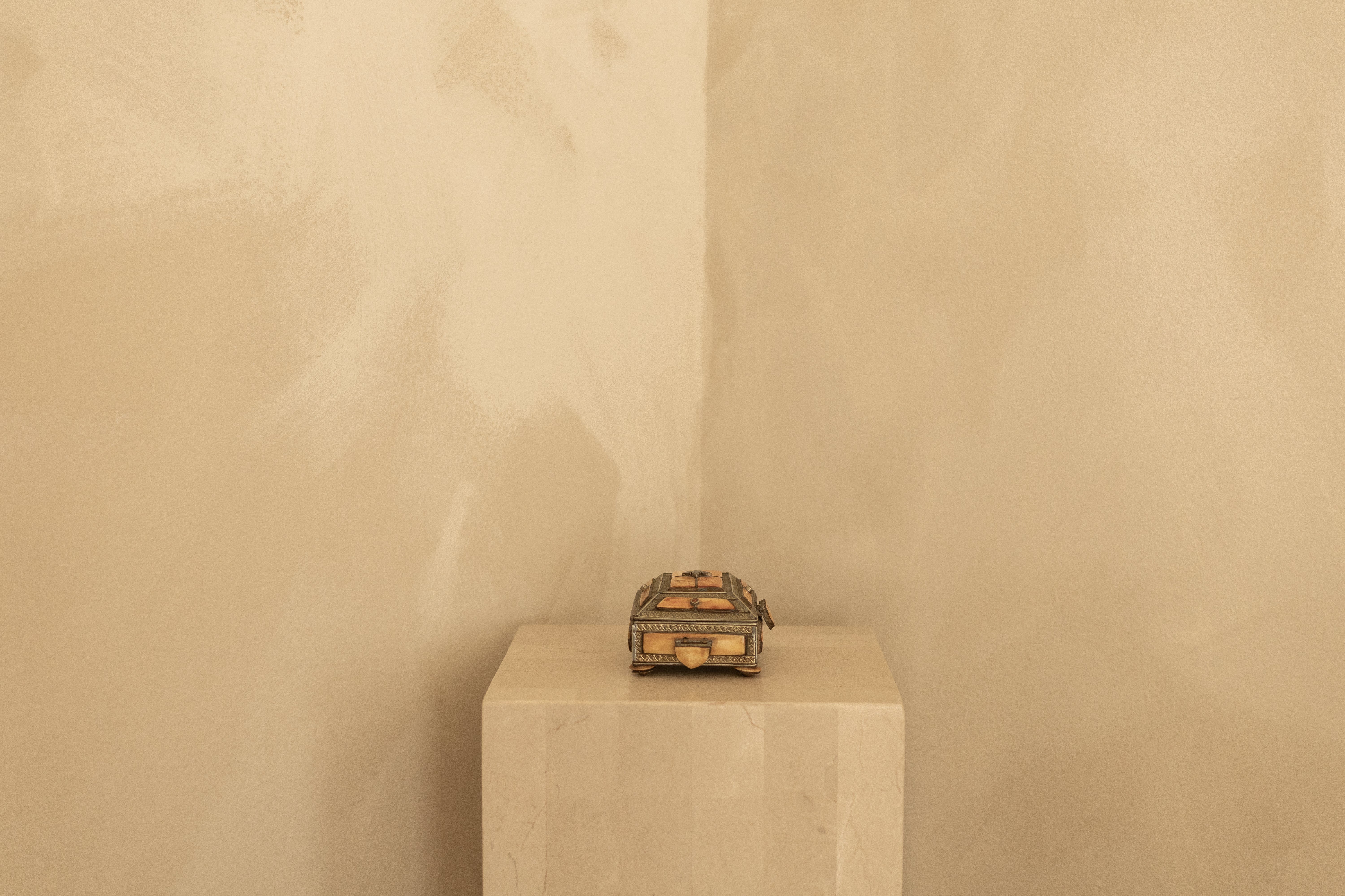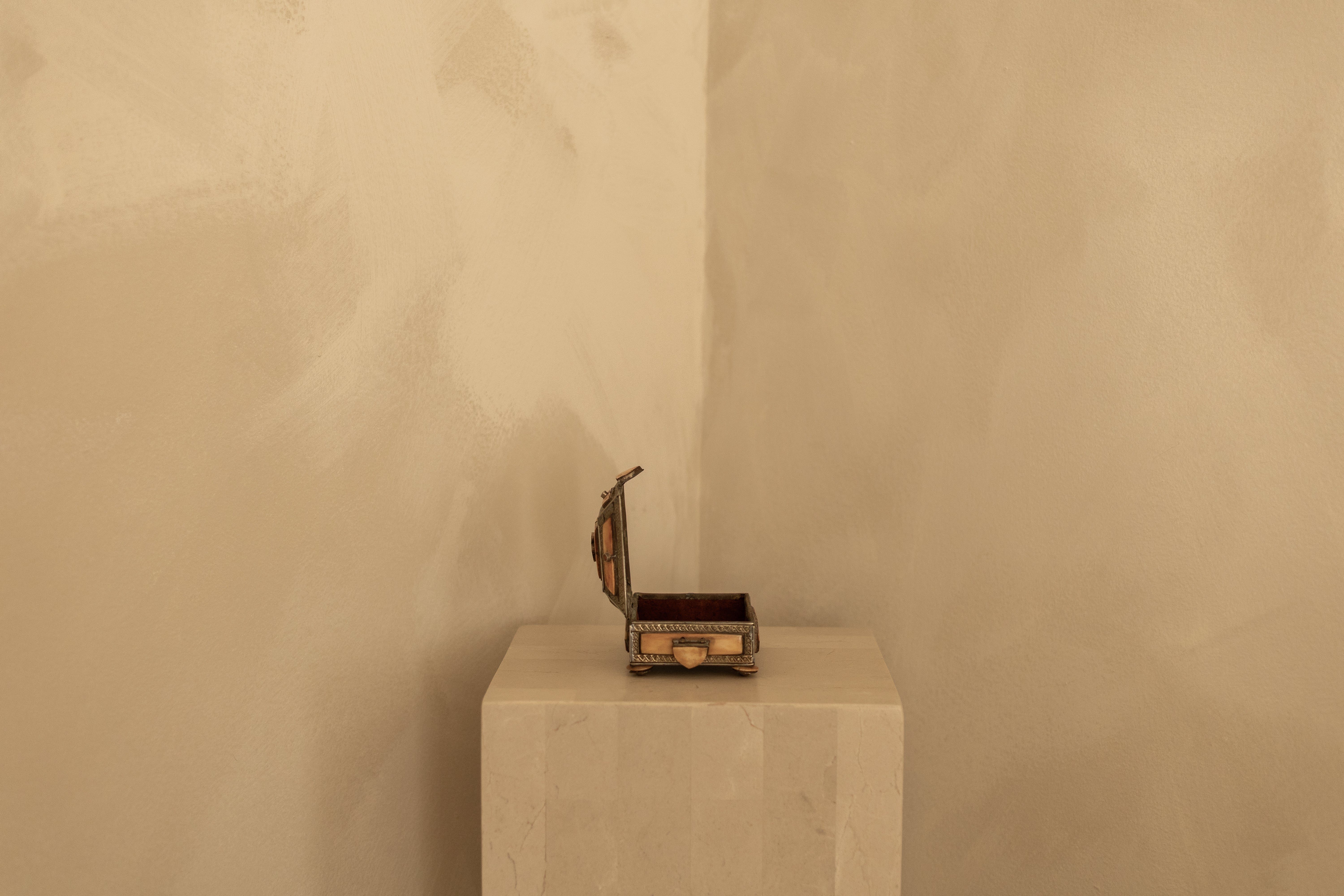 Each panel of bone is individually cut, polished and set by hand, then edged in engraved brass that adds texture and depth. The interior is lined in velvet, creating a soft resting place for rings, heirloom jewellery and treasured keepsakes.