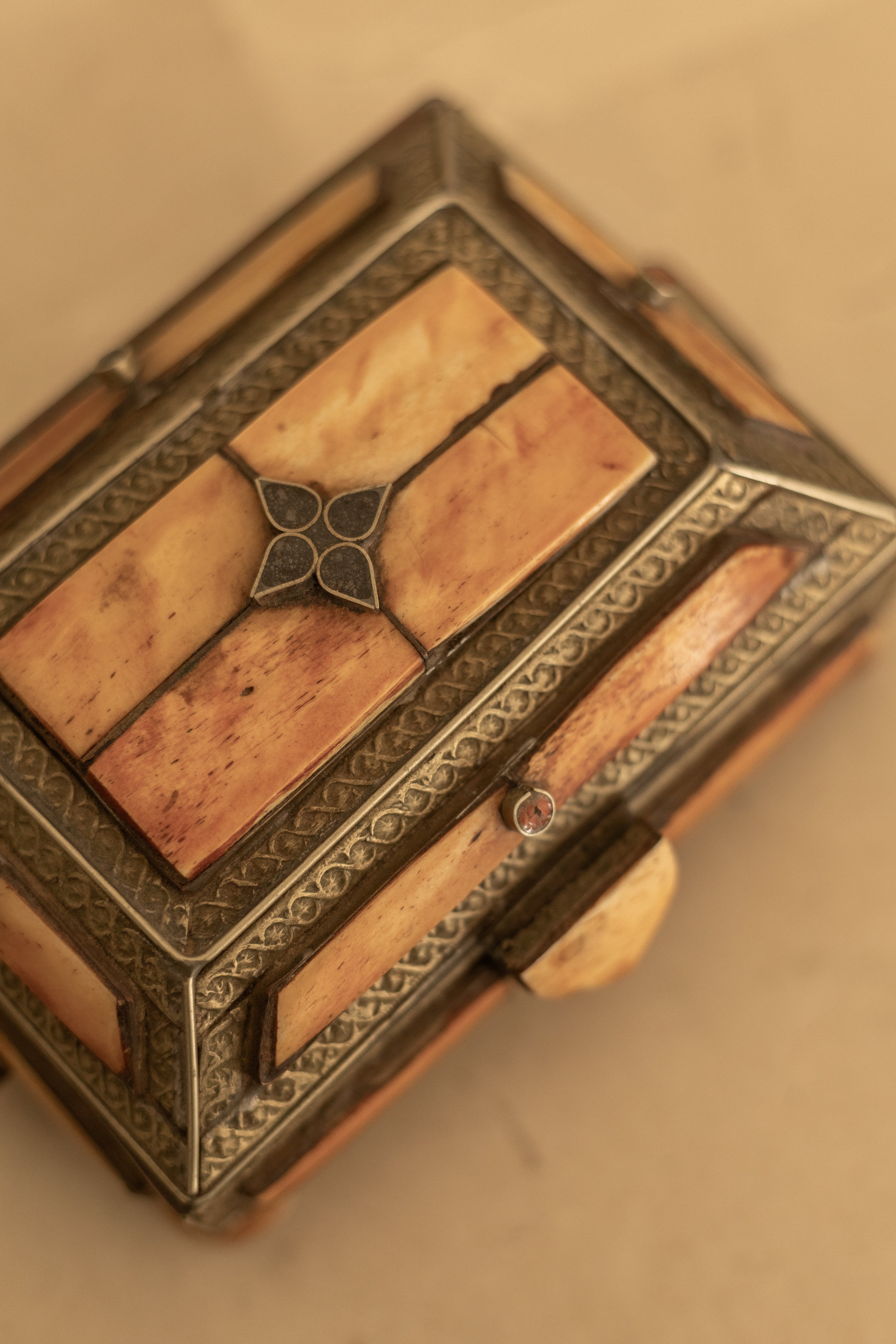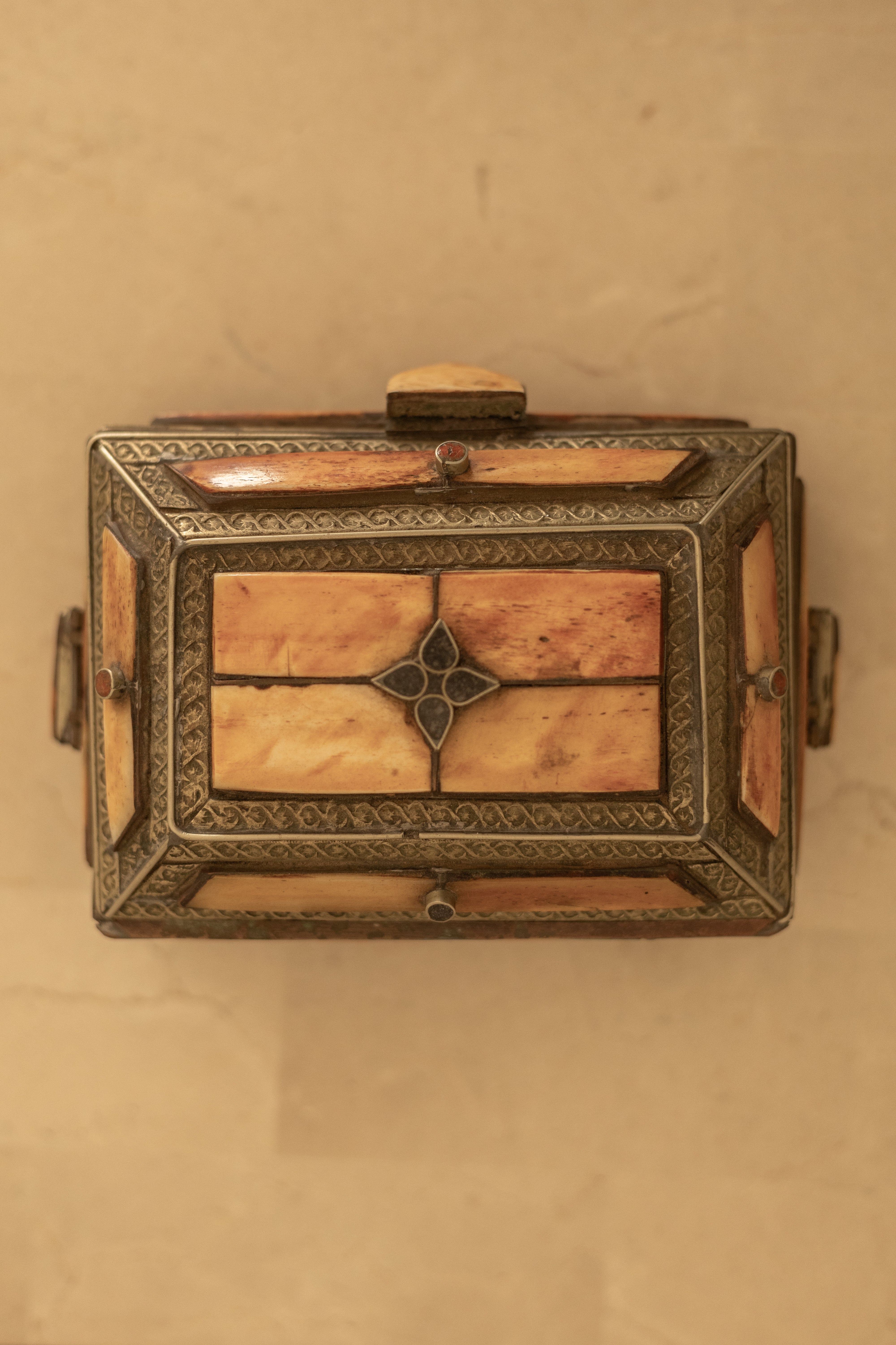 These boxes are traditionally crafted by Moroccan artisans using techniques passed down through generations. Over time, the bone develops a gentle ivory patina and the brass darkens in tone, giving each piece a richness that only age and handcraft can create.