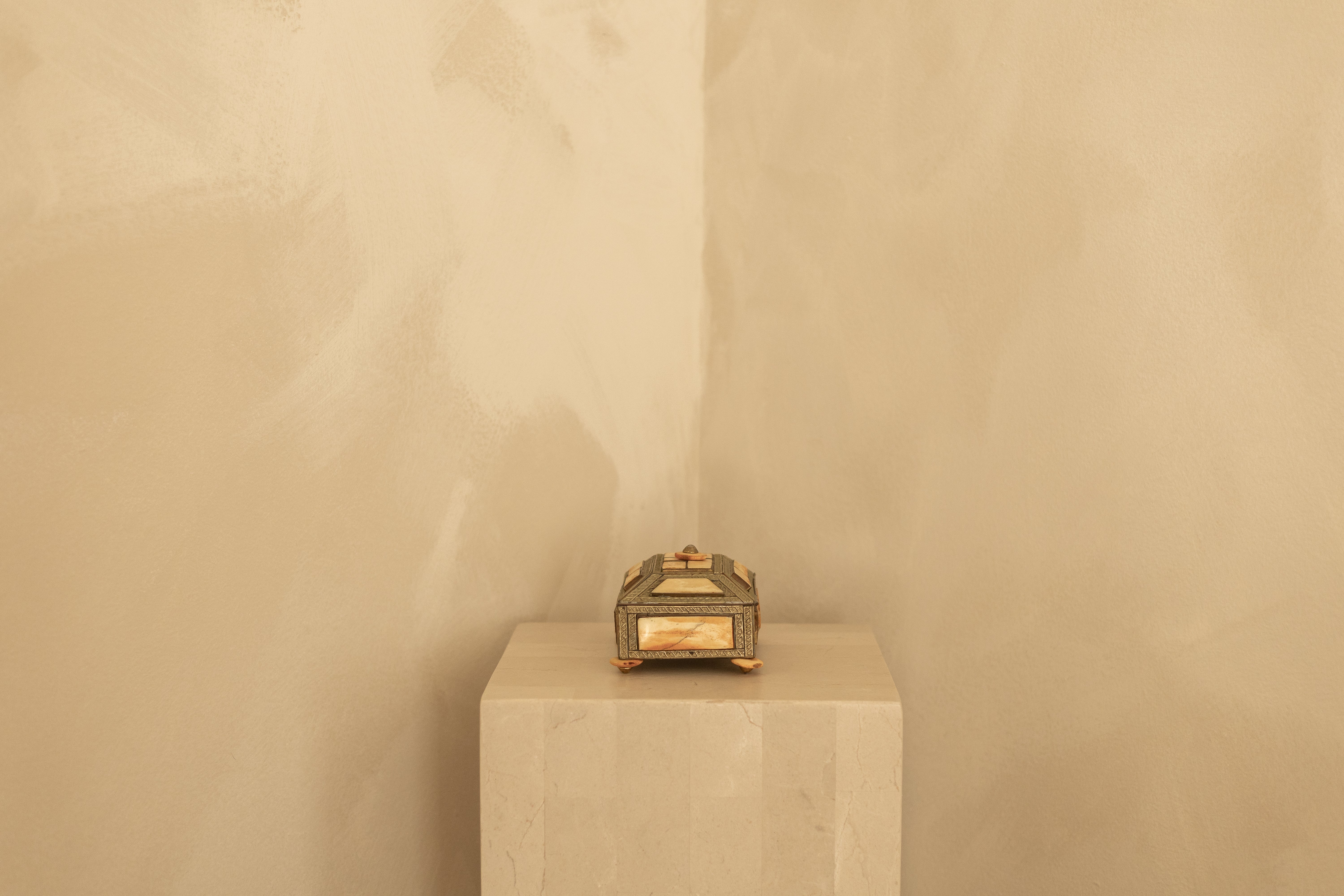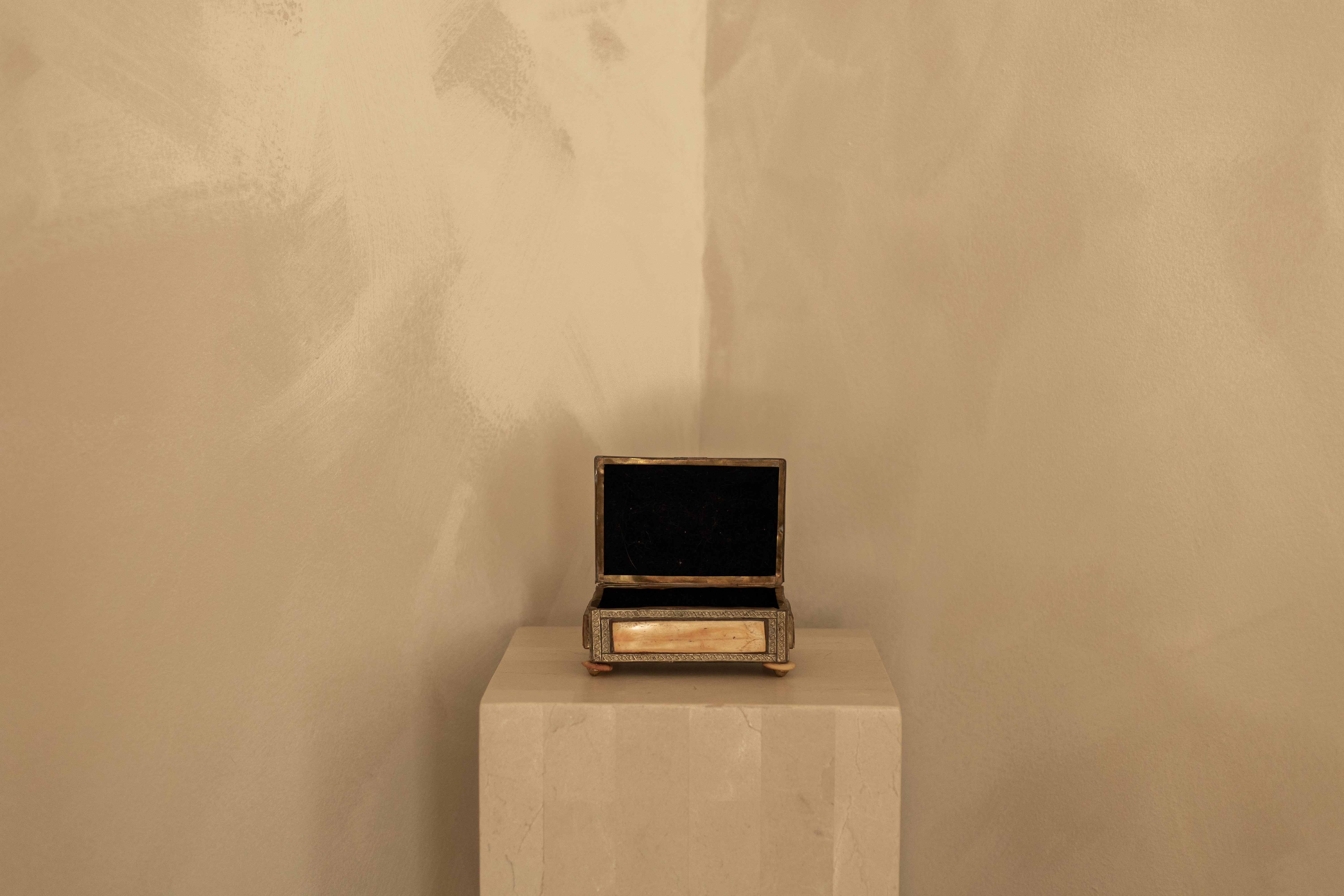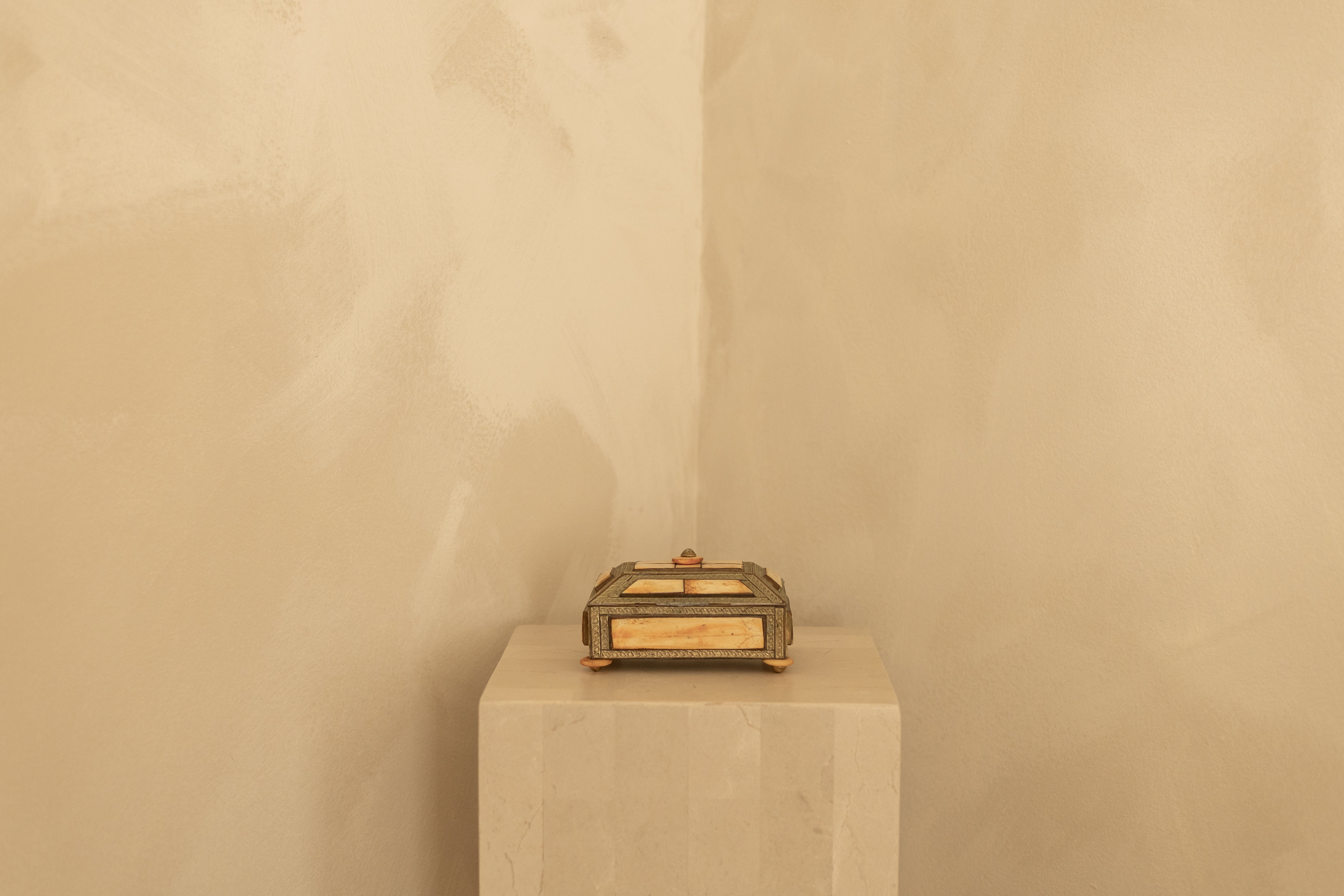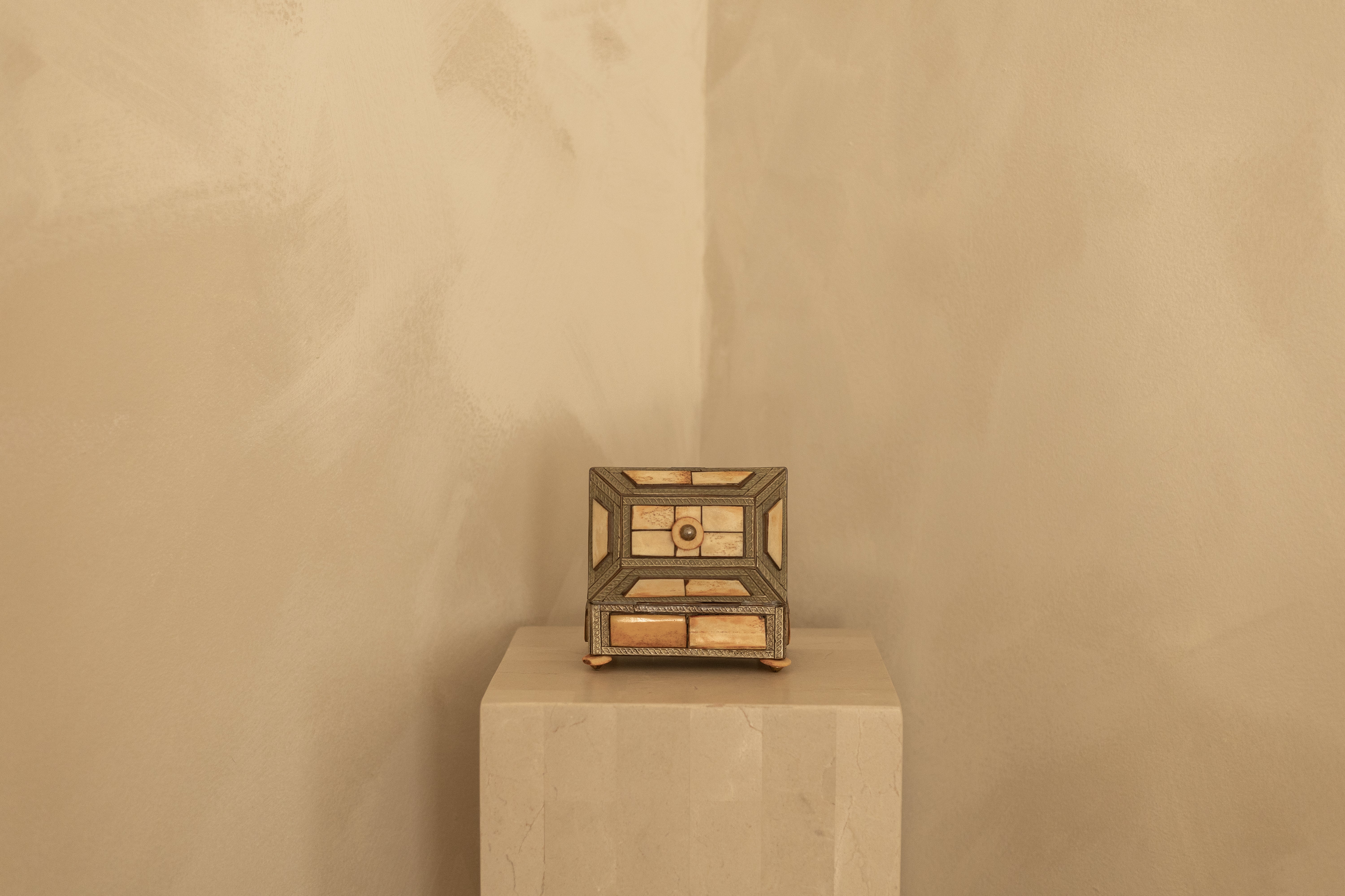 Each panel of bone is individually cut, polished and set by hand, then bordered with etched brass that adds subtle texture and contrast. The interior is lined in velvet, making it ideal for rings, heirloom jewellery, or the small objects you reach for every day.