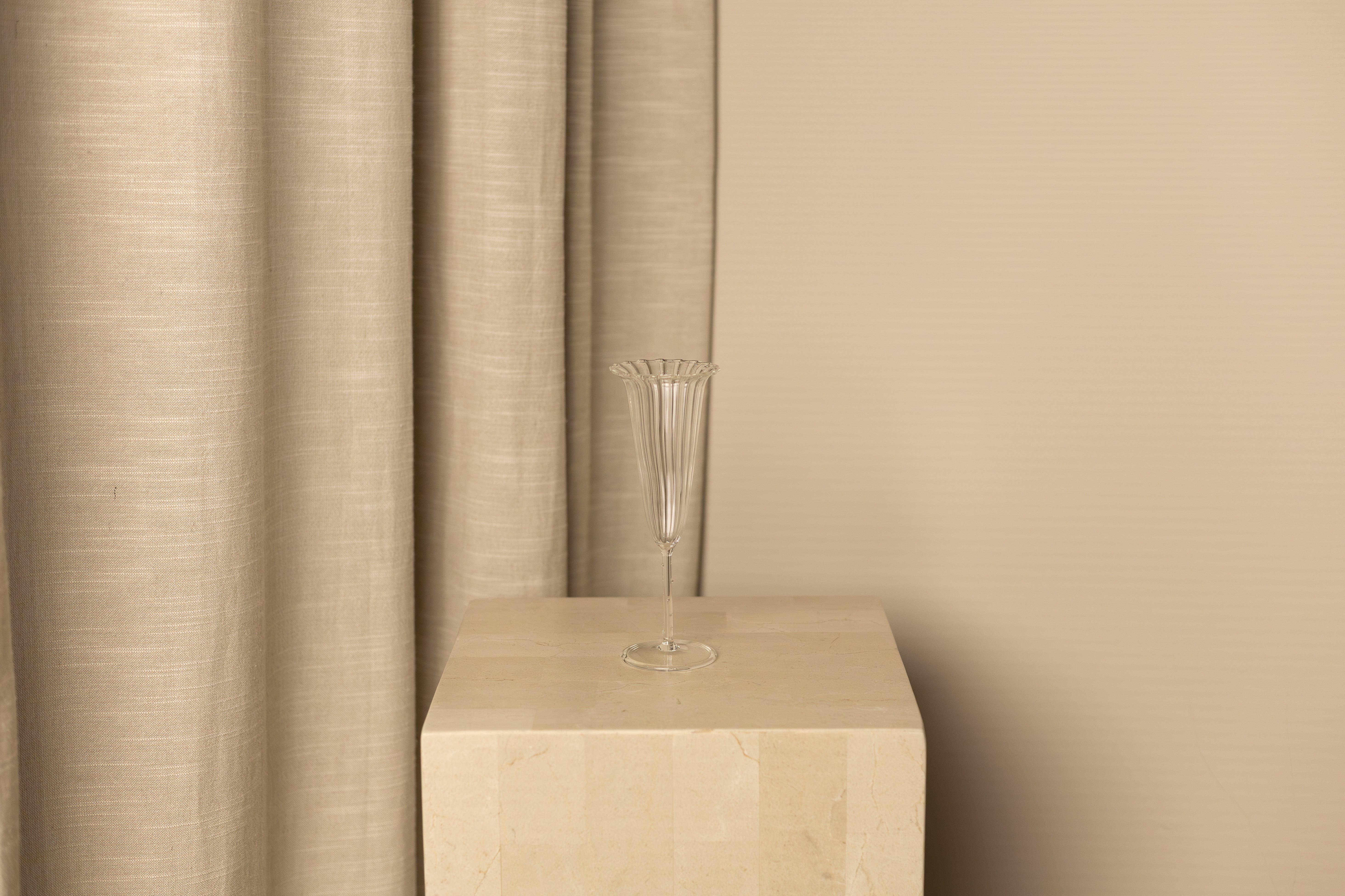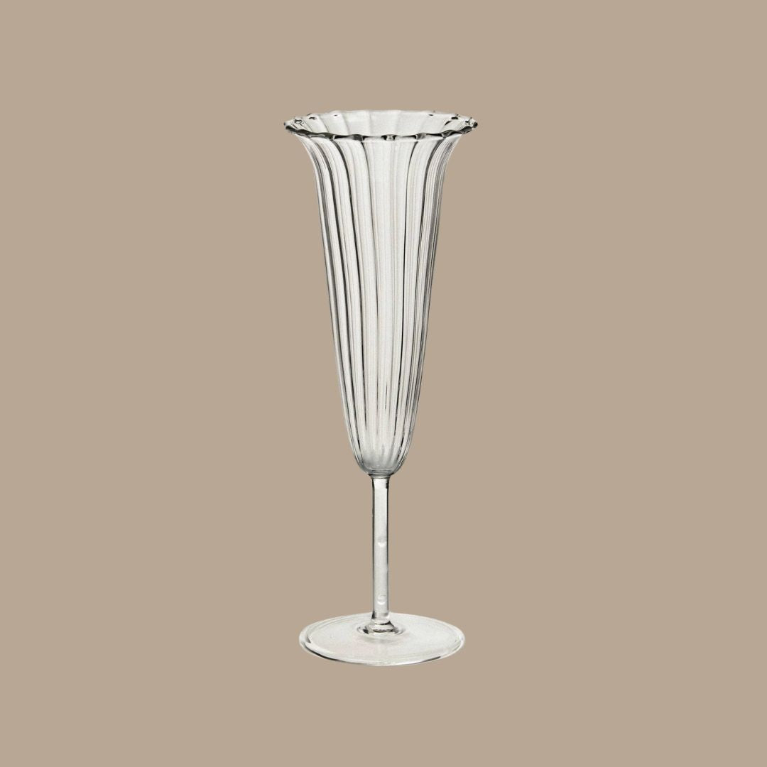 A petite champagne flute, the delicate shape of the cup recalls an Angel Trumpet flower, adding a little touch of magic to an already special drink. Sold as a set of 4. Dimensions: 7–5/8" Tall Capacity: 3.5 oz
