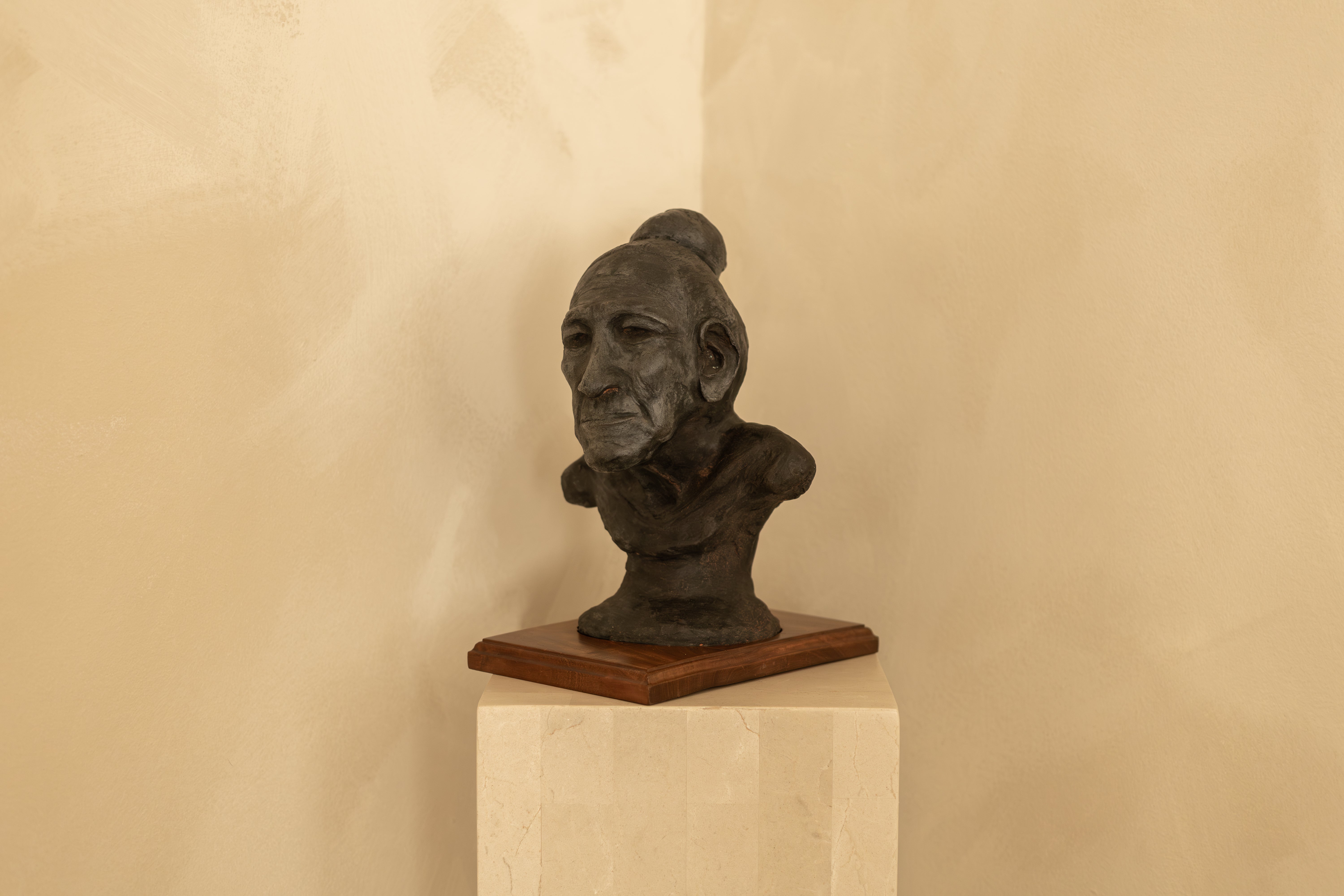 Mounted on a simple wooden plinth, it works as both an art object and a focal point — striking on a console, bookshelf or pedestal, where its stillness and expression can be fully appreciated.