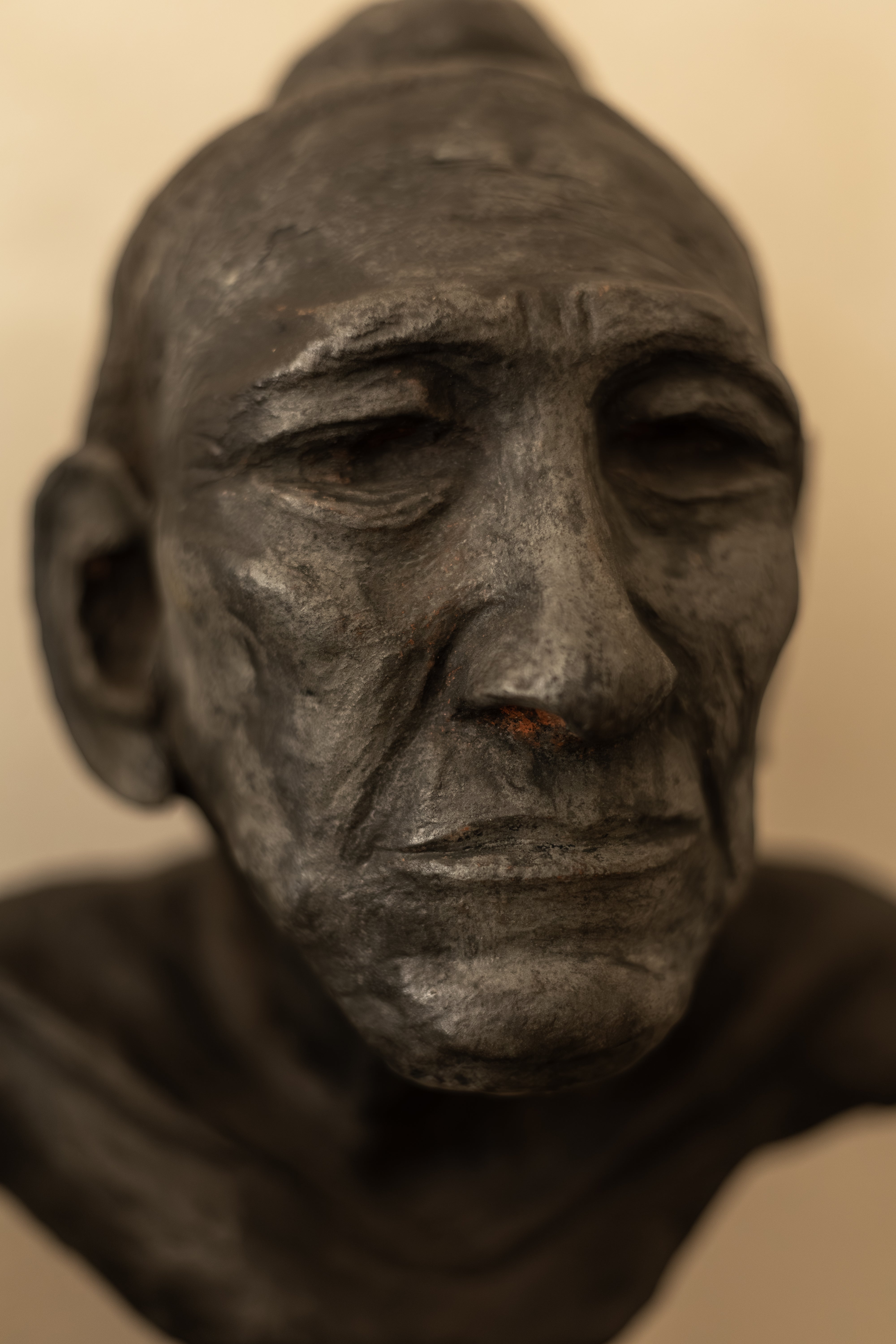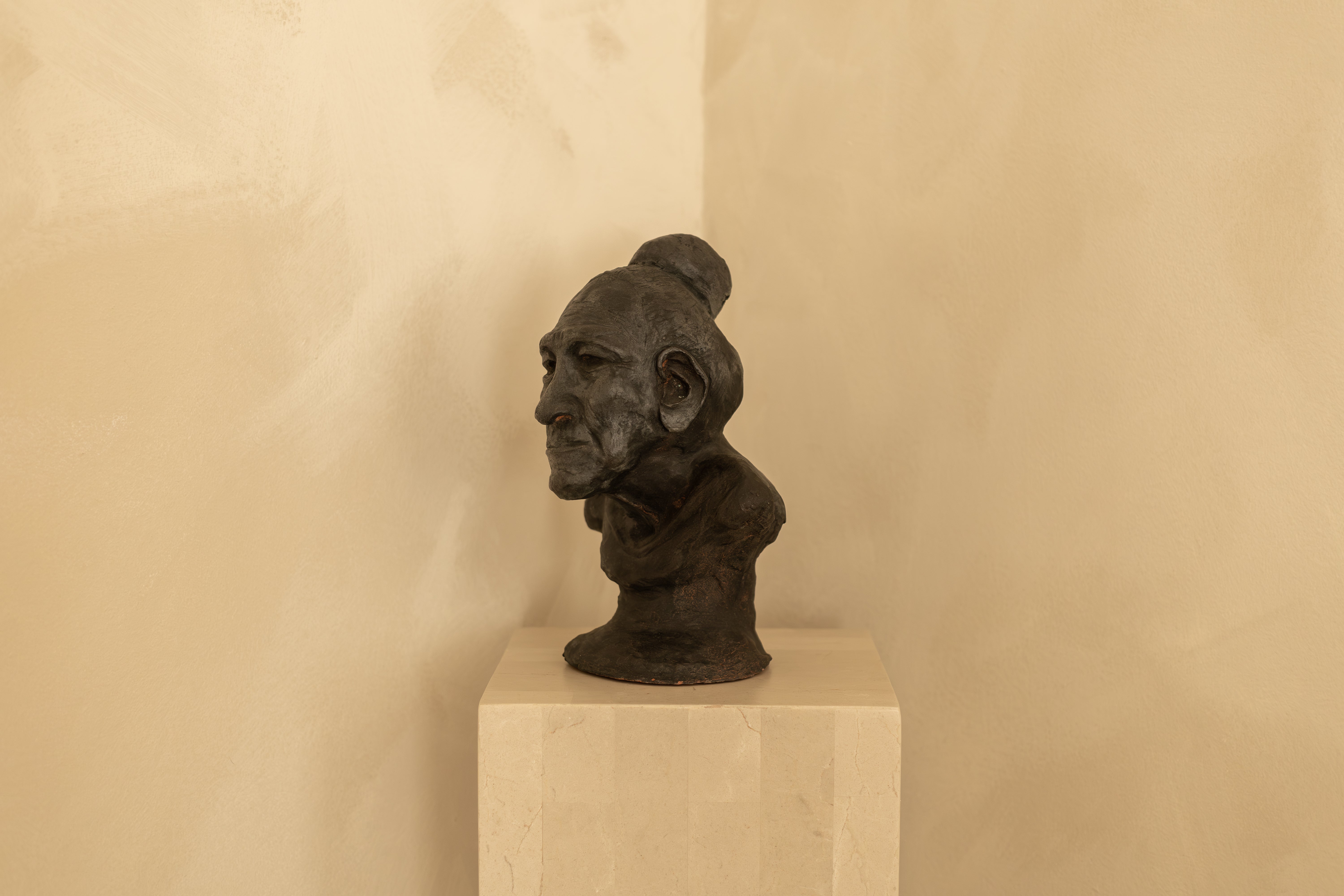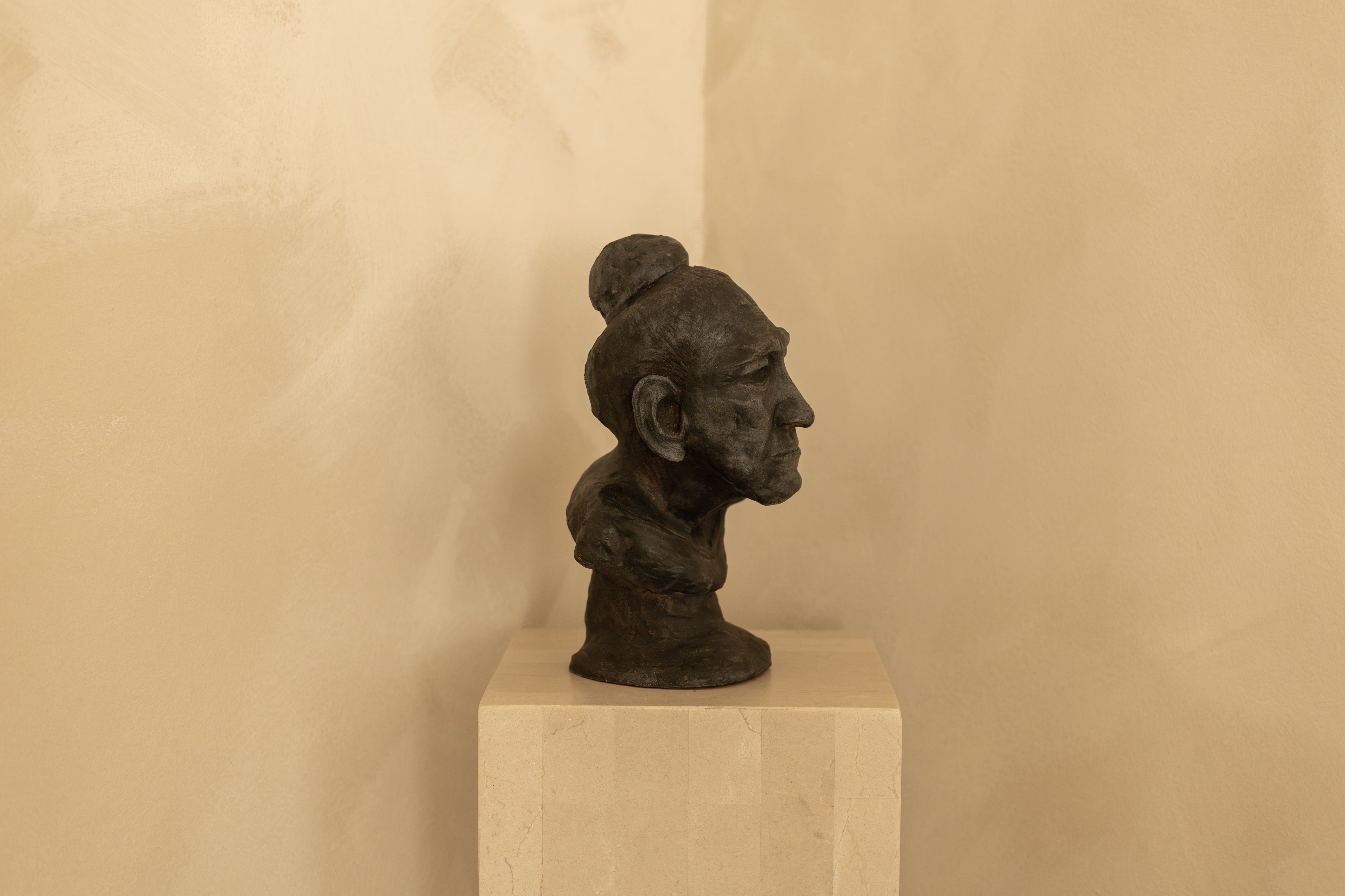 Finished in a darkened patina that settles into the contours of the eyes, cheekbones and lips, the sculpture has the feeling of an archaeological fragment — timeless, grounded, and deeply human. The elongated neck and softly sloped shoulders give the piece a graceful, almost meditative posture.
