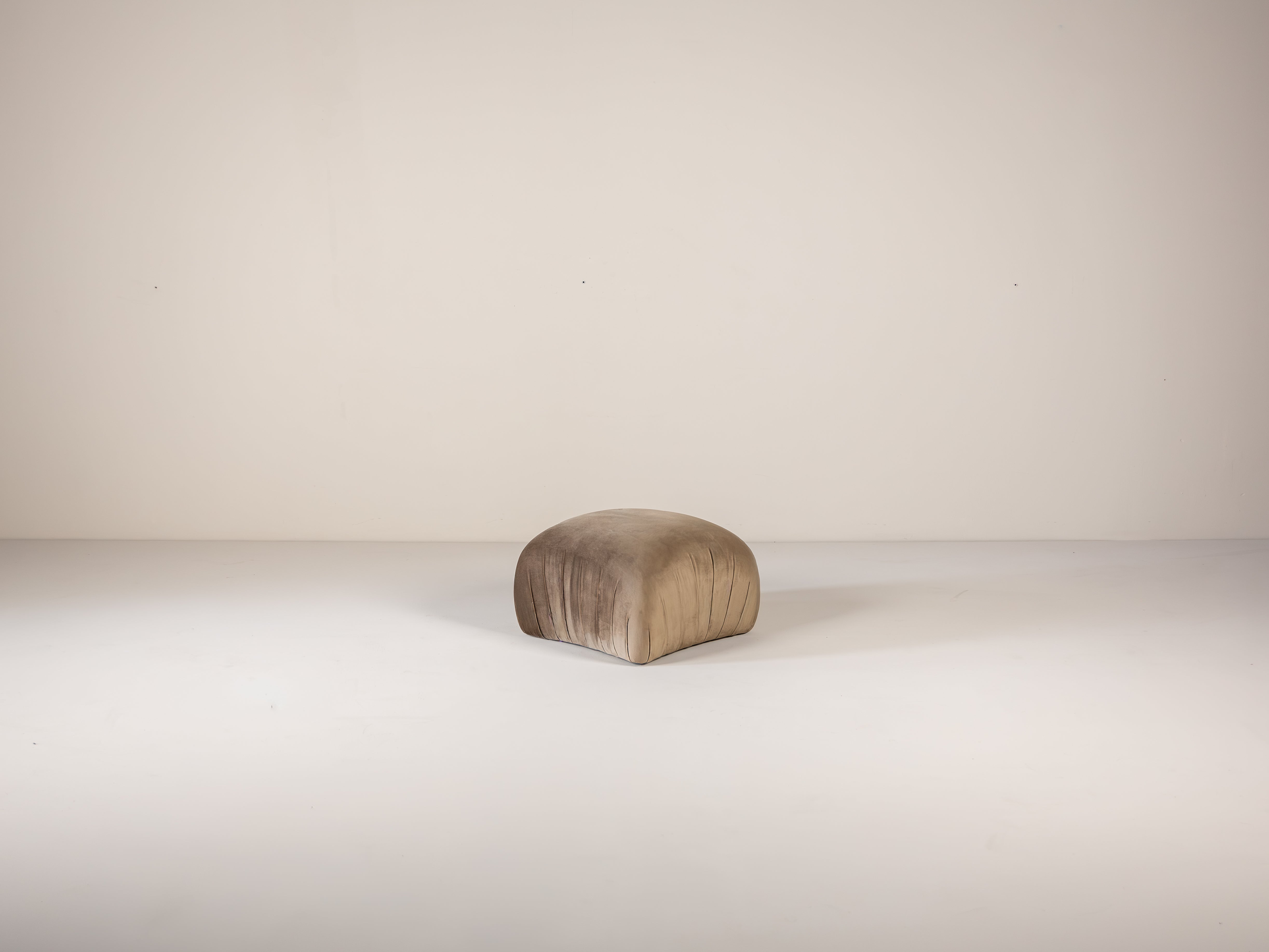 Handcrafted with the same attention to detail, it features subtle tucked fabric detailing that adds a sense of depth and refinement to its sculptural shape. Offering versatile comfort, it serves beautifully as a footrest, extra seating, or a standalone accent.