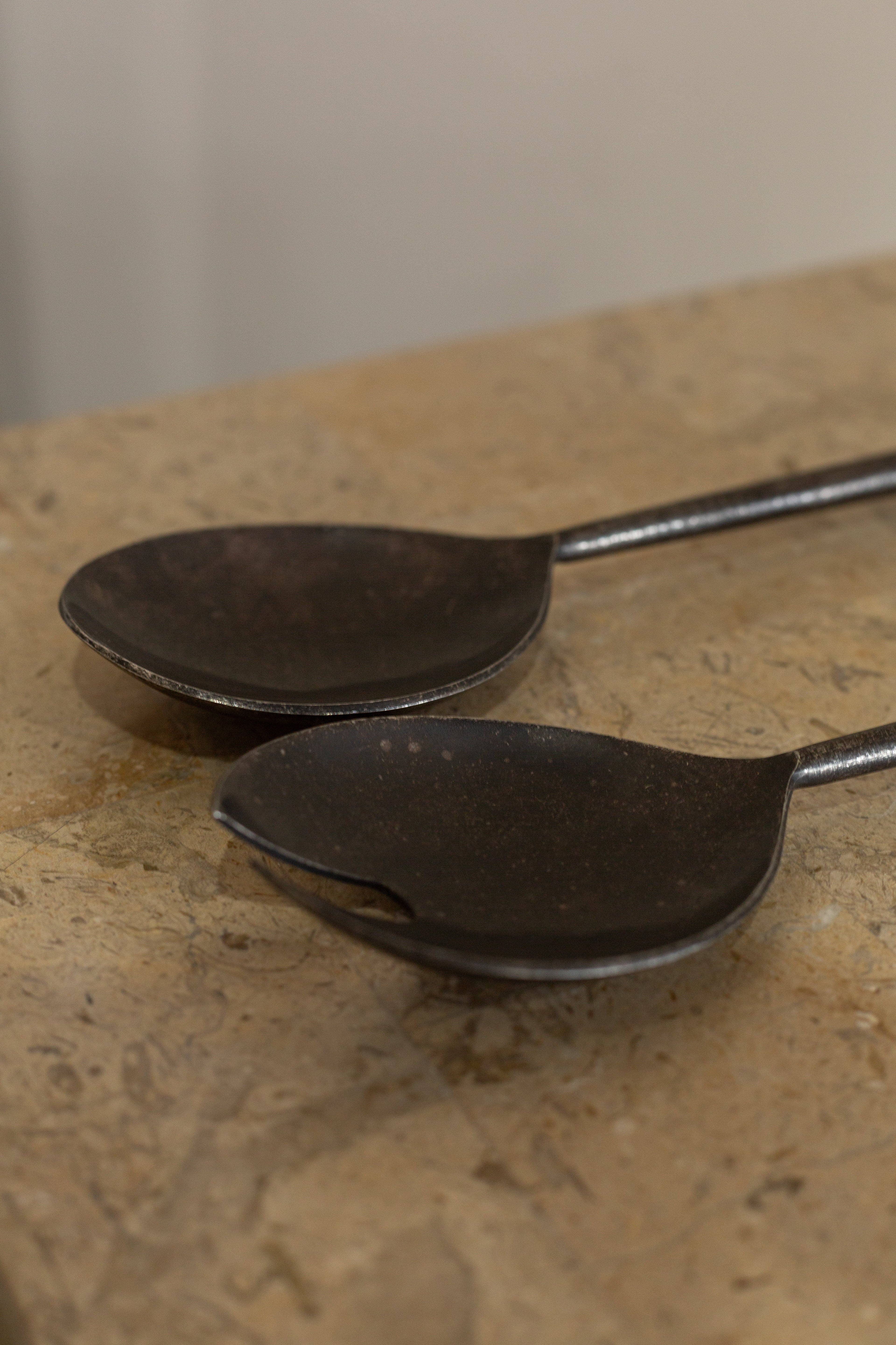 Hand forged in Moradabad, a city in India known for metal craftsmanship. Hand-forged from stainless steel, these servers boast a distinctive distressed matte black finish that proudly bears the authentic marks of their skilled makers. Elevate the presentation of family style pastas and salads with their enduring elegance.