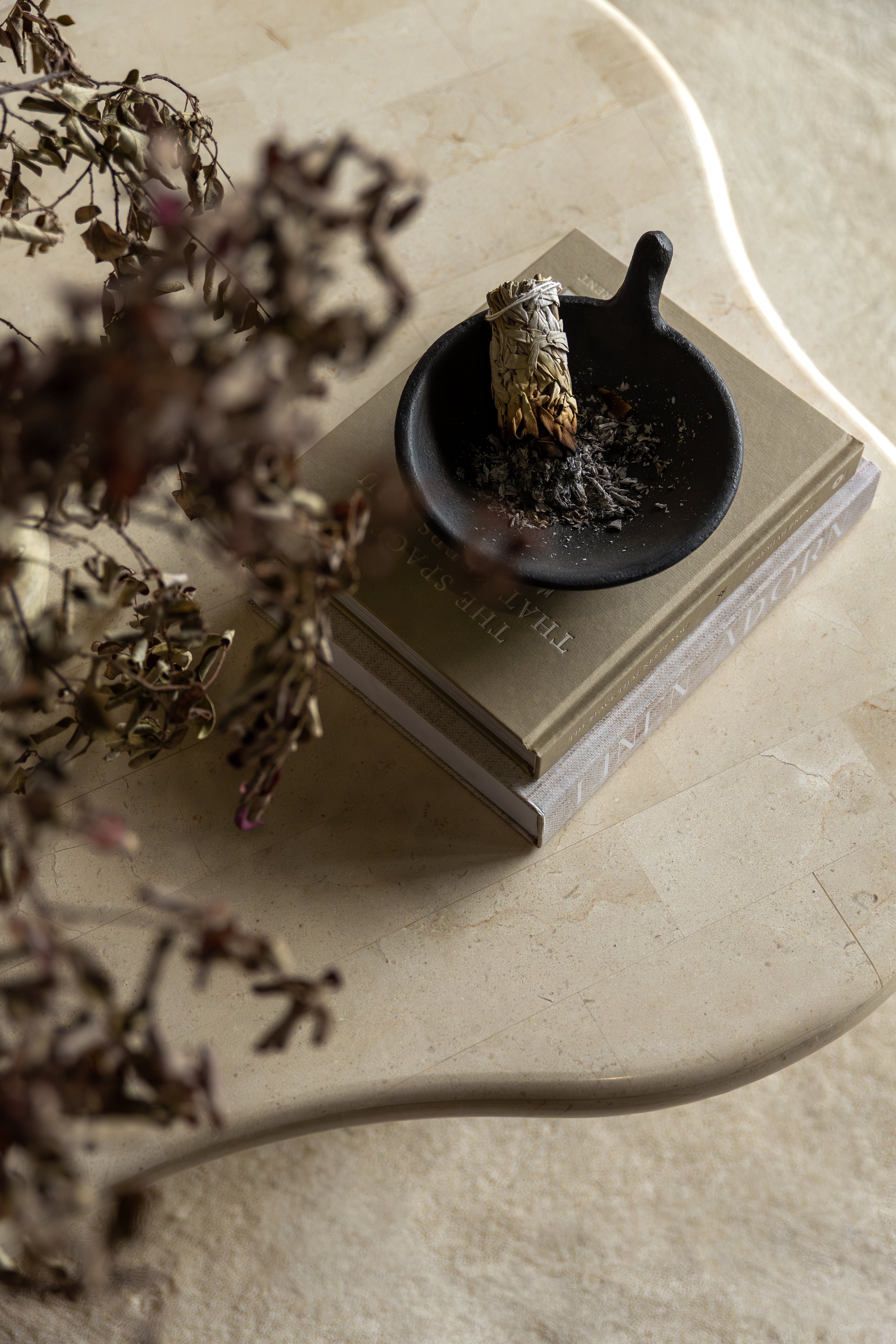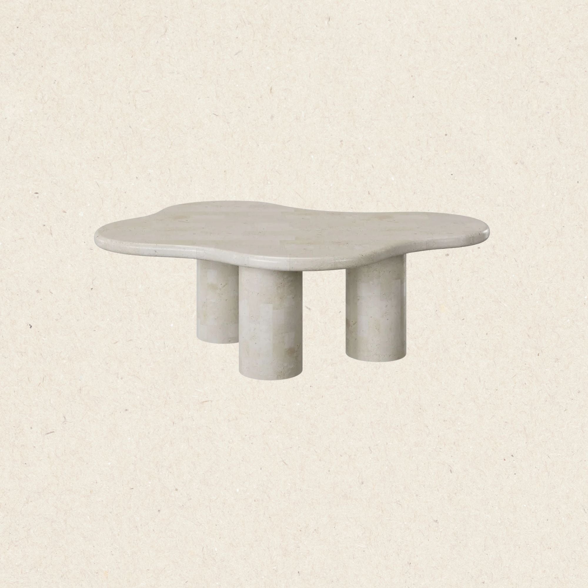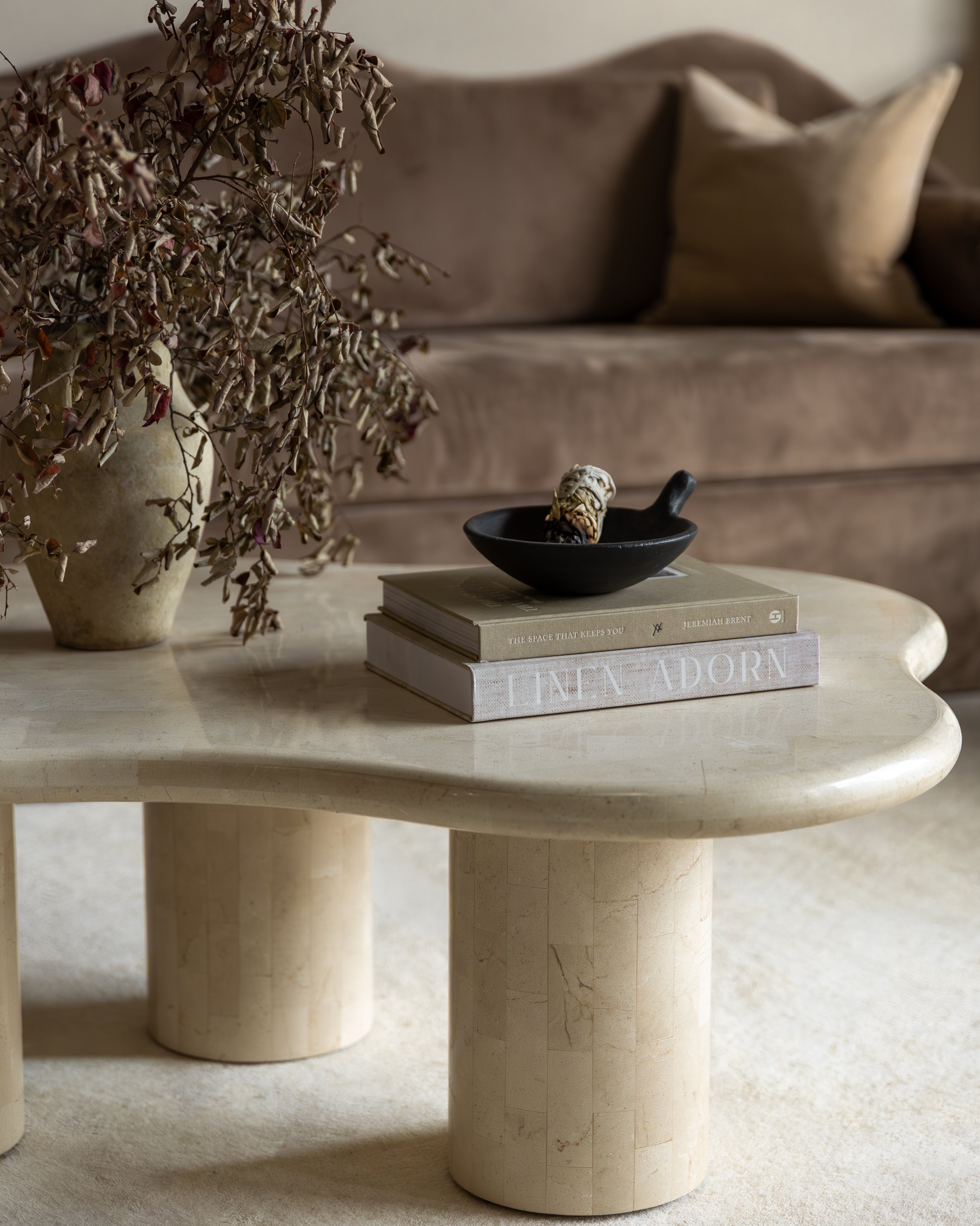 An En Gold design favourite, the Paradis Coffee Table is reimagined in Spanish Beige Marble. Its organic, cloud-like silhouette rests on three cylindrical legs, striking a balance between softness and structural form.