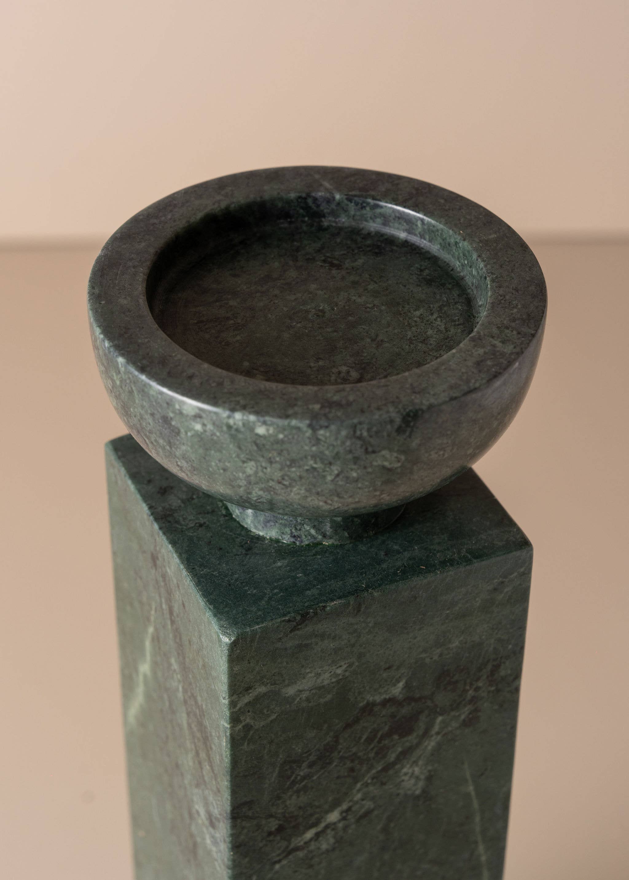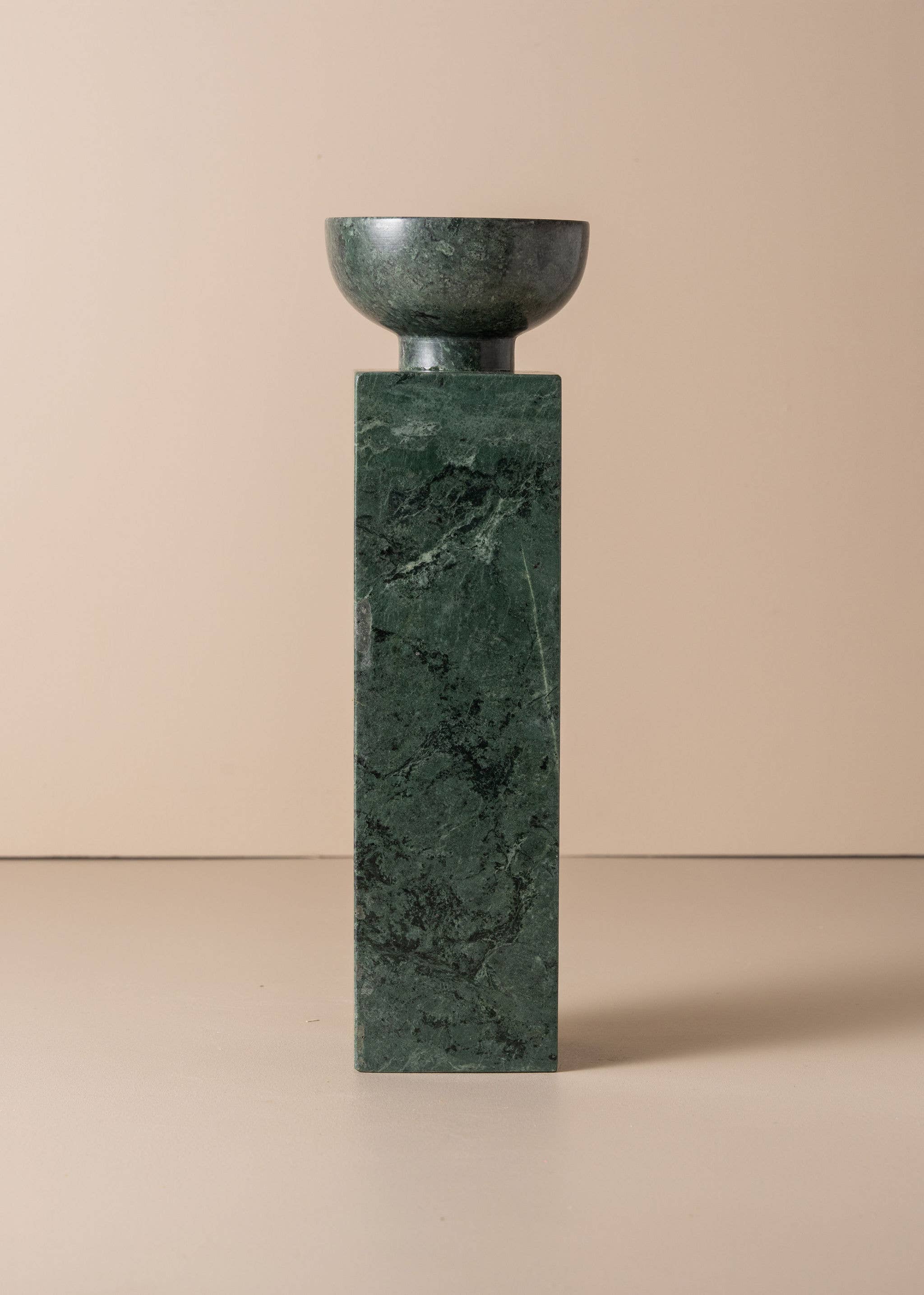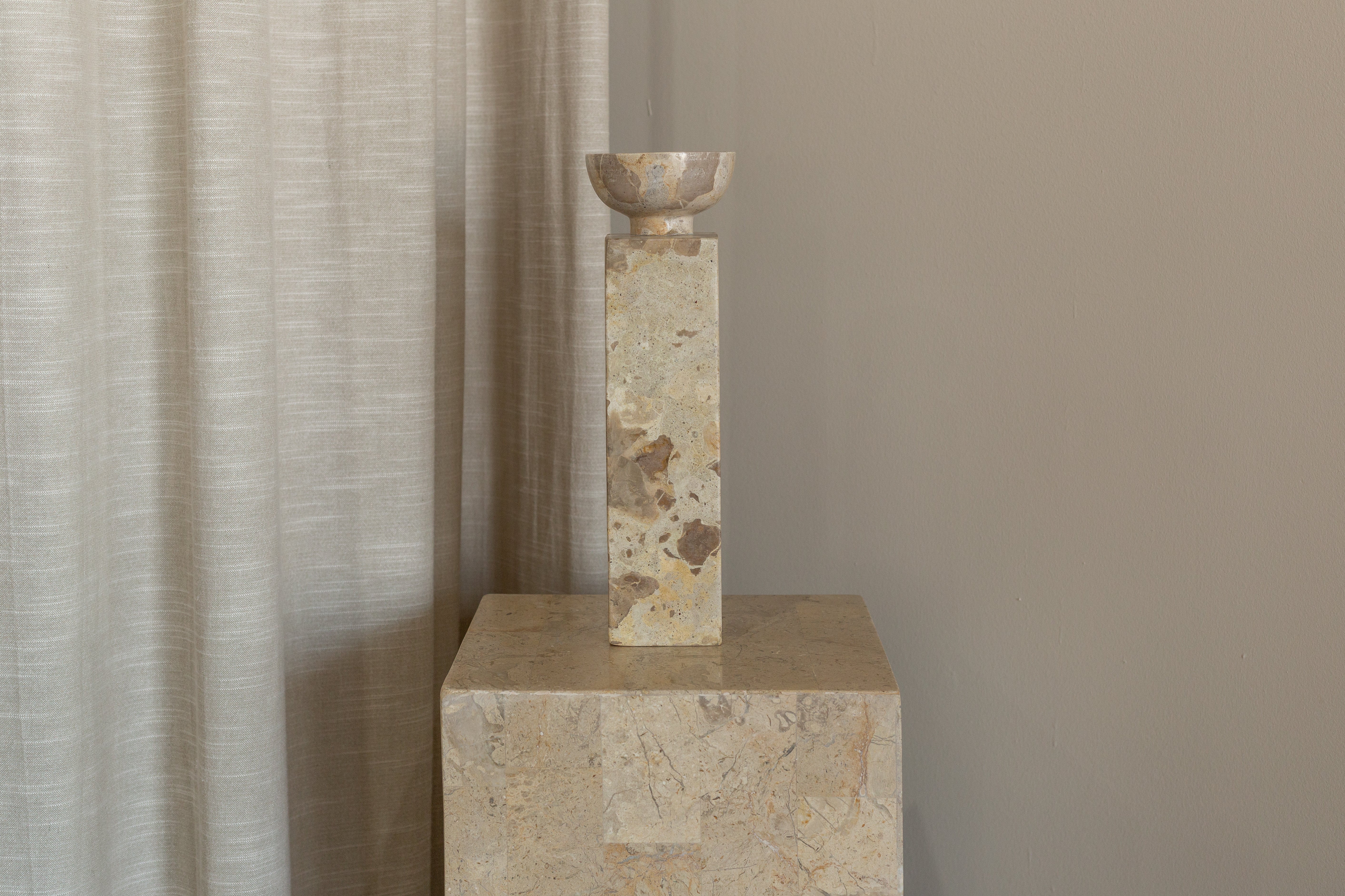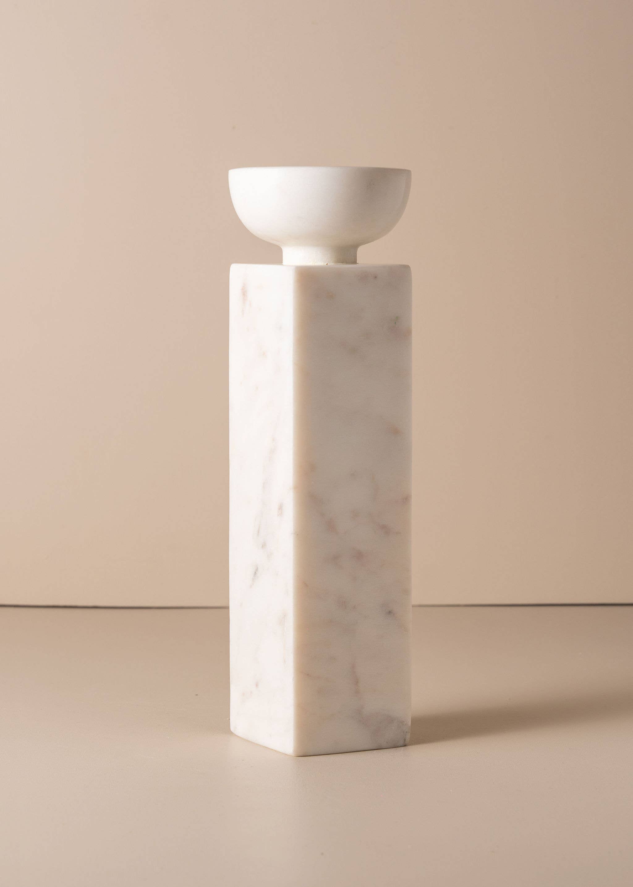 Substantial in scale, the Opus Large Candle Holder is designed to elevate your space with both height and elegance. A tall, square pillar carved from solid marble, it features a refined, rounded top with a recess to hold a medium-sized candle. Bold yet sophisticated, its brutalist silhouette makes a sculptural statement in any setting. Dimensions