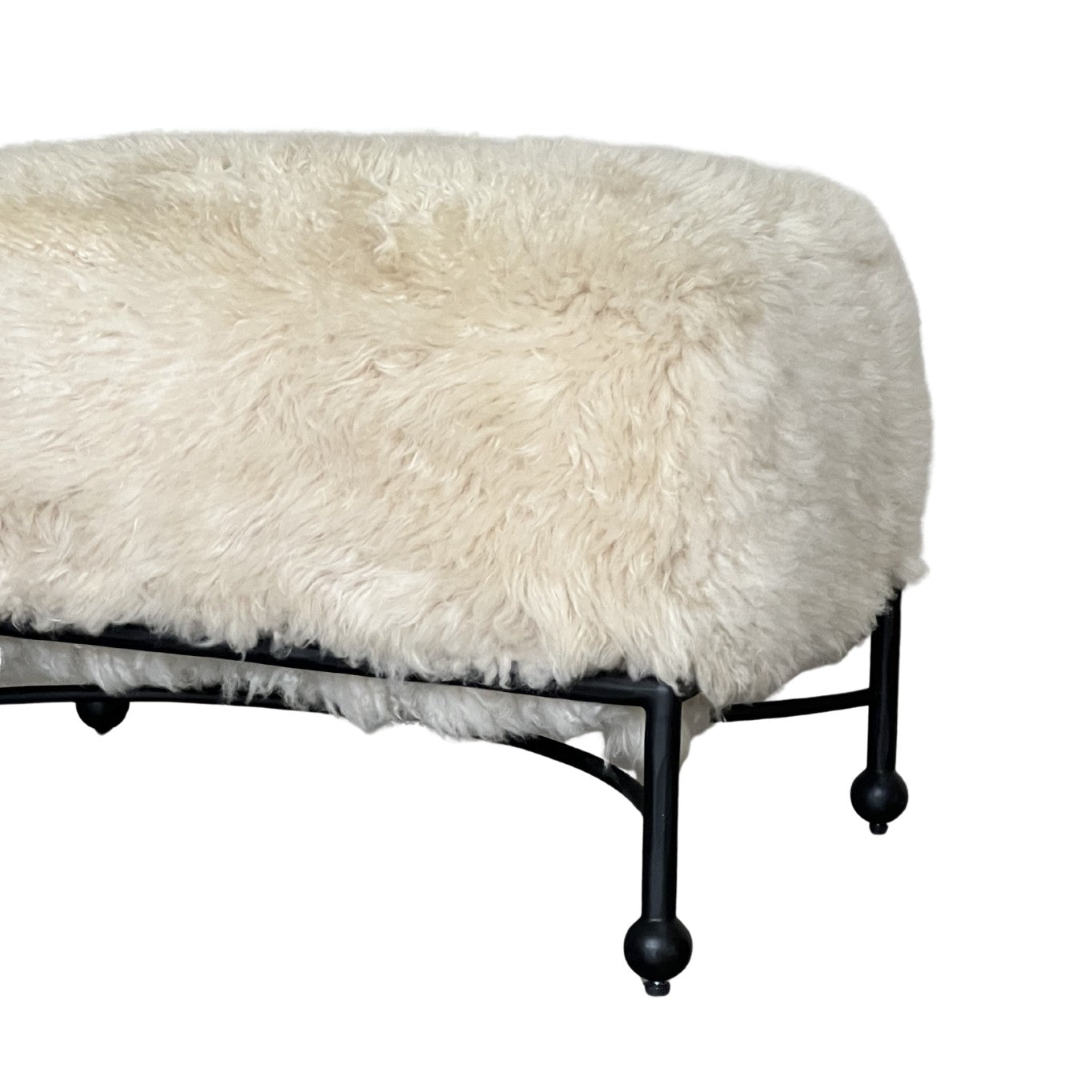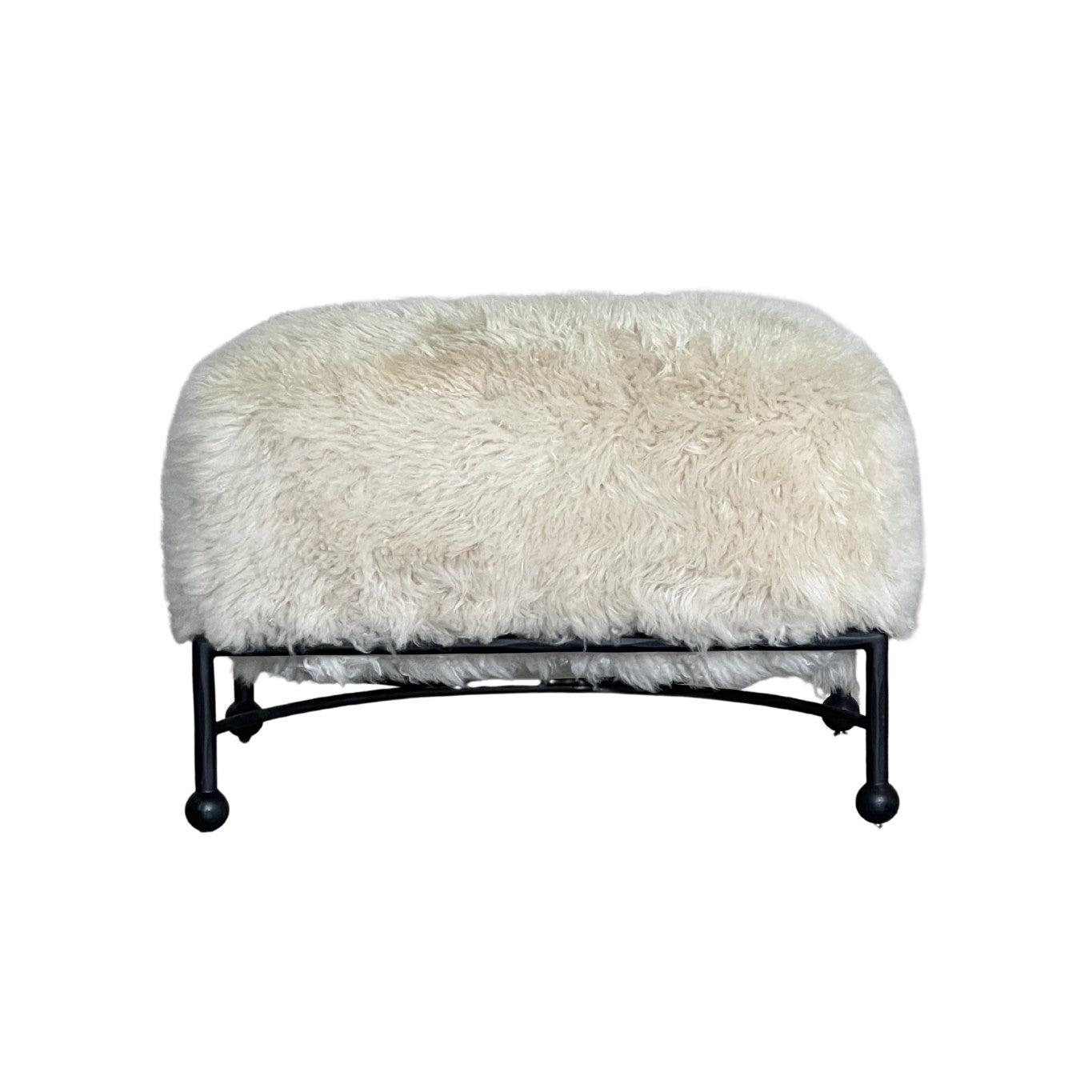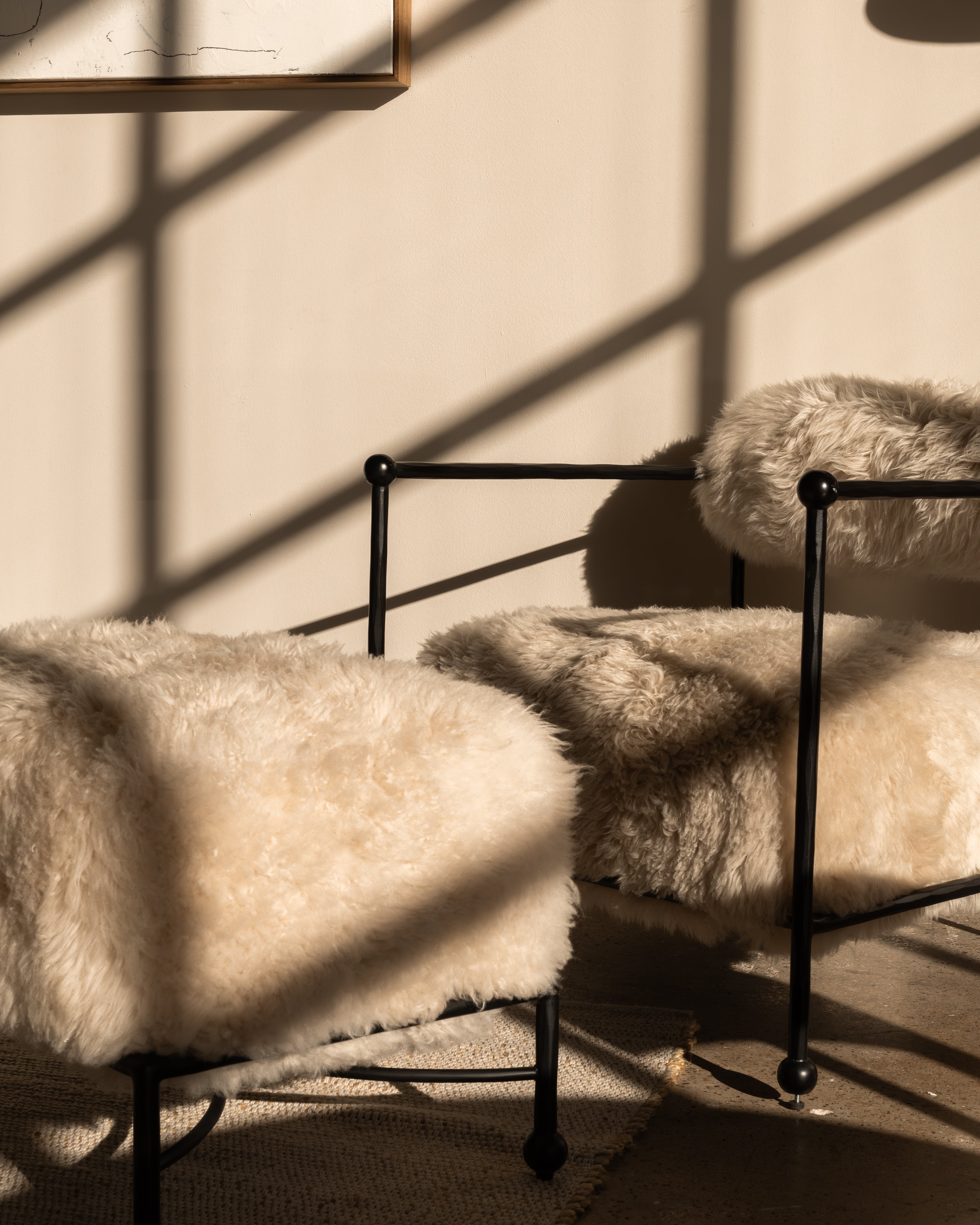 A natural extension of the Wylie Chair, the Wylie Ottoman continues the dialogue between softness and structure. Upholstered in plush shearling, its rounded form rests within a minimalist iron frame, creating a grounded contrast of warmth against strength. Designed to complement or stand alone, it offers a considered balance of comfort and form.